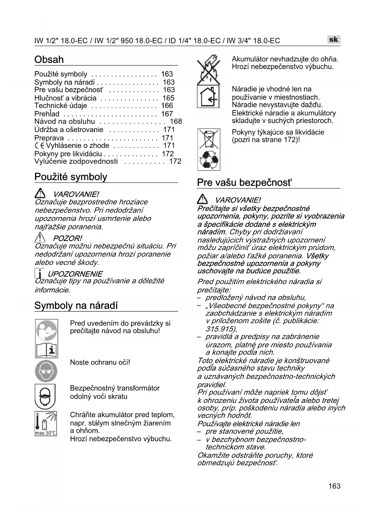 Určené použitie Akumulátorový vŕtací skrutkovač IW 1/2" 18.0-EC / IW 1/2" 950 18.0-EC / ID 1/4" 18.0-EC / IW 3/4" 18.0-EC je určený – na komerčné používanie v priemysle a remeselníctve, – na uťahovanie a uvoľňovanie matíc a skrutiek uvedených rozmerov. Bezpečnostné pokyny pre vŕtačky a skrutkovače Náradie držte len za izolované plochy rukoväti, ak budete vykonávať práce, pri ktorých môže pracovný nástroj alebo skrutka zasiahnuť skryté elektrické vedenia alebo vlastný sieťový kábel. Kontakt skrutky s vedením, ktoré je pod napätím, môže spôsobiť, že aj kovové súčiastky náradia sa dostanú pod napätie, čo má za následok zásah elektrickým prúdom. Používajte prídavné rukoväti, ak sú súčasťou dodávky tohto elektrického náradia. Strata kontroly môže viesť k poraneniam. Používajte vhodné detekčné prístroje na vyhľadávanie skrytých elektrických vedení alebo sa obráťte na miestny energetický podnik. Kontakt s elektrickými vedeniami môže spôsobiť požiar alebo mať za následok úraz elektrickým prúdom. Poškodenie plynového potrubia môže mať za následok výbuch. Preniknutie do vodovodného potrubia spôsobí vecné škody. Elektrické náradie okamžite vypnite, keď sa vkladací nástroj zablokuje. Buďte pripravený na vysoké reakčné momenty, ktoré spôsobujú spätný ráz. Vkladací nástroj sa zablokuje, keď: – sa elektrické náradie preťaží alebo – sa sprieči v opracovávavom obrobku. Elektrické náradie držte pevne. Pri uťahovaní a uvoľňovaní skrutiek sa môžu krátkodobo vyskytnúť vysoké reakčné momenty. Zaistite obrobok. Obrobok, ktorý je uchytený upínacími zariadeniami alebo zverákom, je držaný spoľahlivejšie ako vašou rukou. Skôr než elektrické náradie odložíte, počkajte, kým sa úplne nezastaví. Vkladací nástroj sa môže zachytiť a viesť k strate kontroly nad elektrickým náradím. Používajte len originálne akumulátory s napätím, ktoré je uvedené na výrobnom štítku vášho elektrického náradia. Pri použití iných akumulátorov, napr. napodobnenín, repasovaných akumulátorov alebo cudzích výrobkov, hrozí nebezpečenstvo poranení a vecných škôd následkom výbuchu akumulátora. Bezpečnostné upozornenia pre zaobchádzanie s akumulátormi Neotvárajte akumulátor. Hrozí nebezpečenstvo skratu. Chráňte akumulátor pred horúčavou, napr. aj pred stálym slnečným žiarením, ohňom, vodou a vlhkosťou. Hrozí nebezpečenstvo výbuchu. Pri poškodení a nesprávnom použití akumulátora môžu unikať pary. Zaistite prívod čerstvého vzduchu a pri problémoch vyhľadajte lekársku pomoc. Pary môžu dráždiť dýchacie cesty. Ak sa akumulátor používa nevhodne, môže z neho unikať kvapalina. Vyhýbajte sa kontaktu s ňou. V prípade náhodného kontaktu umyte postihnuté miesto vodou. Ak sa dostane akumulátorová kvapalina do očí, vyhľadajte okrem toho aj lekársku pomoc. Vytekajúca kvapalina môže spôsobiť podráždenie pokožky alebo popáleniny. Akumulátory nabíjajte len nabíjačkami, ktoré odporúča výrobca. Ak nabíjate nabíjačkou určenou pre určitý druh akumulátorov iné akumulátory, hrozí nebezpečenstvo požiaru. Špicatými predmetmi, ako napr. klince alebo skrutkovače alebo pôsobením vonkajšej sily môže dôjsť k poškodeniu akumulátora. Môže dôjsť k internému skratu a vznieteniu, vzniku dymu, výbuchu alebo k prehriatiu akumulátoraIW 1/2" 18.0-EC / IW 1/2" 950 18.0-EC / ID 1/4" 18.0-EC / IW 3/4" 18.0-EC