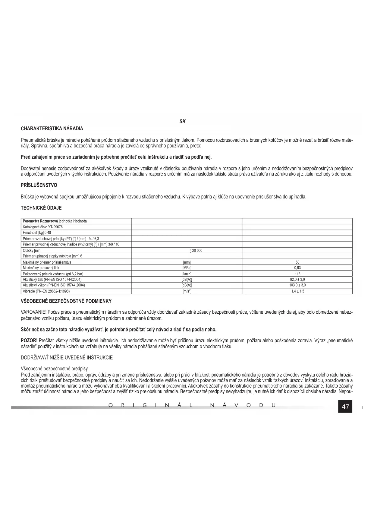 VAROVANIE! Počas práce s pneumatickým náradím sa odporúča vždy dodržiavať základné zásady bezpečnosti práce, včítane uvedených ďalej, aby bolo obmedzené nebez- pečenstvo vzniku požiaru, úrazu elektrickým prúdom a zabránené úrazom. Skôr než sa začne toto náradie využívať, je potrebné prečítať celý návod a riadiť sa podľa neho. POZOR! Prečítať všetky nižšie uvedené inštrukcie. Ich nedodržiavanie môže byť príčinou úrazu elektrickým prúdom, požiaru alebo poškodenia zdravia. Výraz „pneumatické náradie” použitý v inštrukciach sa vzťahuje na všetky náradia poháňané stlačeným vzduchom o vhodnom tlaku. DODRŽIAVAŤ NIŽŠIE UVEDENÉ INŠTRUKCIE Všeobecné bezpečnostné predpisy Pred zahájením inštalácie, práce, opráv, údržby a pri zmene príslušenstva, alebo pri práci v blízkosti pneumatického náradia je potrebné z dôvodov výskytu celého radu hrozia- cich rizík preštudovať bezpečnostné predpisy a naučiť sa ich. Nedodržanie vyššie uvedených pokynov môže mať za následok vznik ťažkých úrazov. Inštaláciu, zoraďovanie a montáž pneumatického náradia môžu vykonávať oba kvalifi kovaní a školení pracovníci. Akékoľvek zásahy do konštrukcie pneumatického náradia sú zakázané. Takéto zásahy môžu znížiť účinnosť náradia a jeho bezpečnosť a zvýšiť riziko pre obsluhu náradia. Bezpečnostné predpisy nevyhadzujte, je nutné ich dať k dispozícii obsluhe náradia. Nepou-48