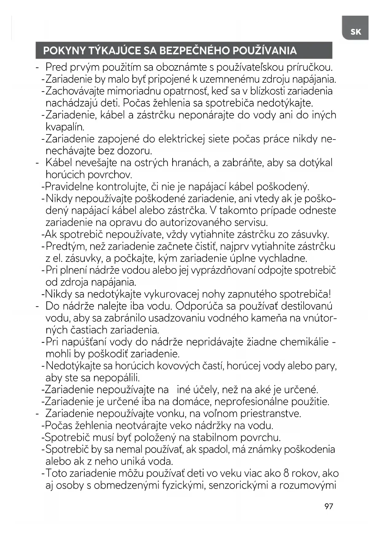 Pri používaní zariadenia je potrebné postupovať opatrne, pretože vyžaruje paru. - Nedovoľte, aby sa kábel dotýkal horúcich povrchov.99