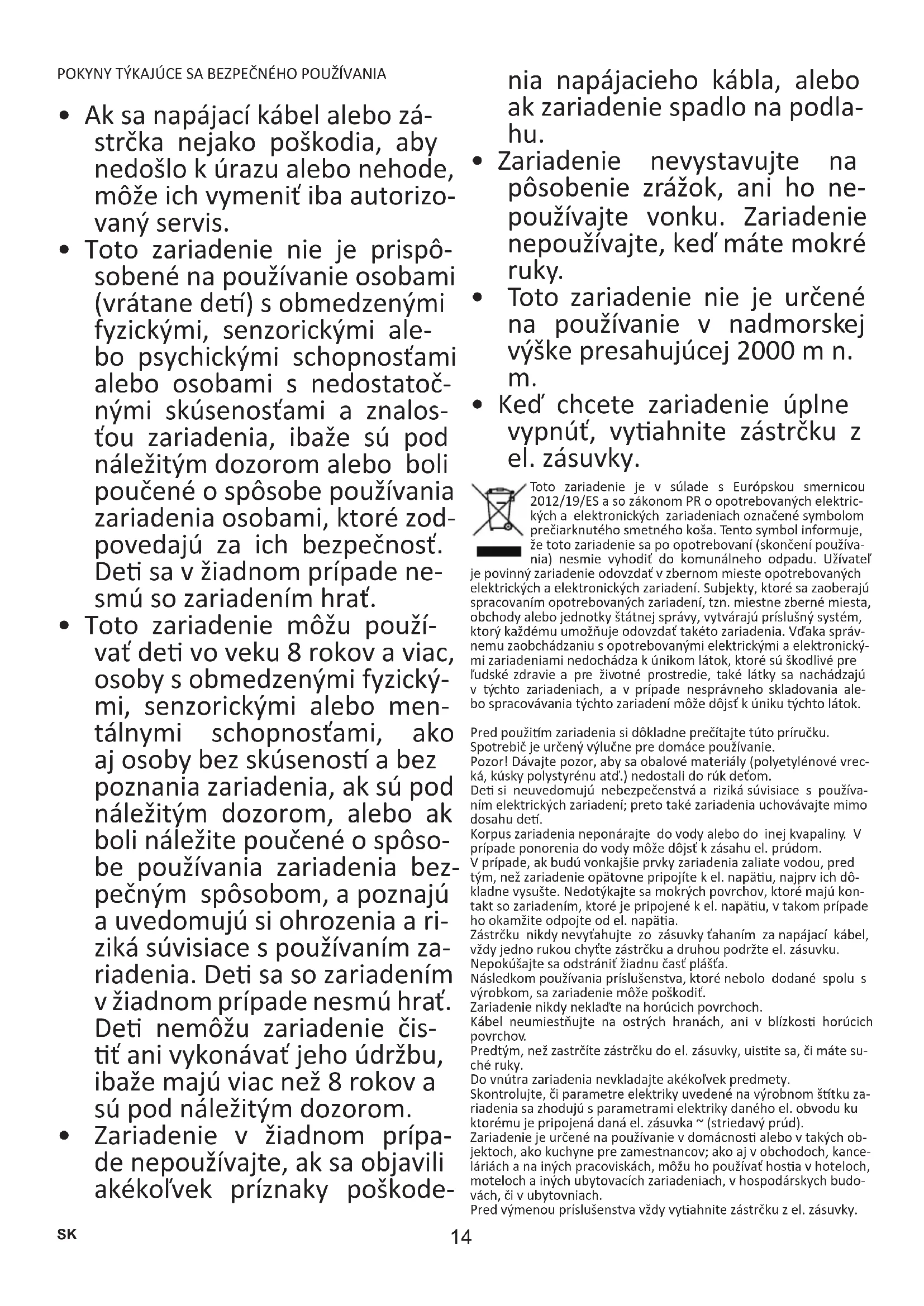 - Toto zariadenie môžu použí- vať de vo veku 8 rokov a viac, osoby s obmedzenými fyzický- mi, senzorickými alebo men- tálnymi schopnosťami, ako aj osoby bez skúsenos a bez poznania zariadenia, ak sú pod náležitým dozorom, alebo ak boli náležite poučené o spôso- be používania zariadenia bez- pečným spôsobom, a poznajú a uvedomujú si ohrozenia a ri- ziká súvisiace s používaním za- riadenia. De sa so zariadením v žiadnom prípade nesmú hrať. De nemôžu zariadenie čis- ť ani vykonávať jeho údržbu, ibaže majú viac než 8 rokov a sú pod náležitým dozorom.