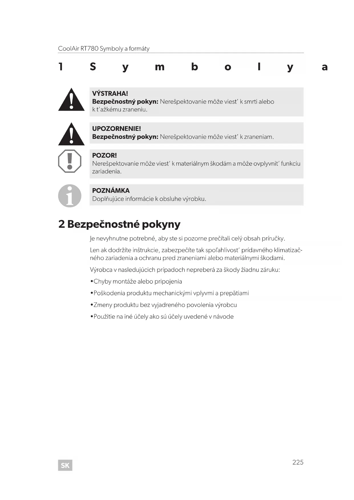 - Použitie na iné účely ako sú účely uvedené v návode VÝSTRAHA! Bezpečnostný pokyn: Nerešpektovanie môže viest’ k smrti alebo k t’ažkému zraneniu. UPOZORNENIE! Bezpečnostný pokyn: Nerešpektovanie môže viest’ k zraneniam. POZOR! Nerešpektovanie môže viest’ k materiálnym škodám a môže ovplyvnit’ funkciu zariadenia. POZNÁMKA Doplňujúce informácie k obsluhe výrobku. RT780-Iveco--I-16s.book Seite 225 Donnerstag, 6. Juli 2017 3:16 15SK Bezpečnostné pokyny CoolAir RT780