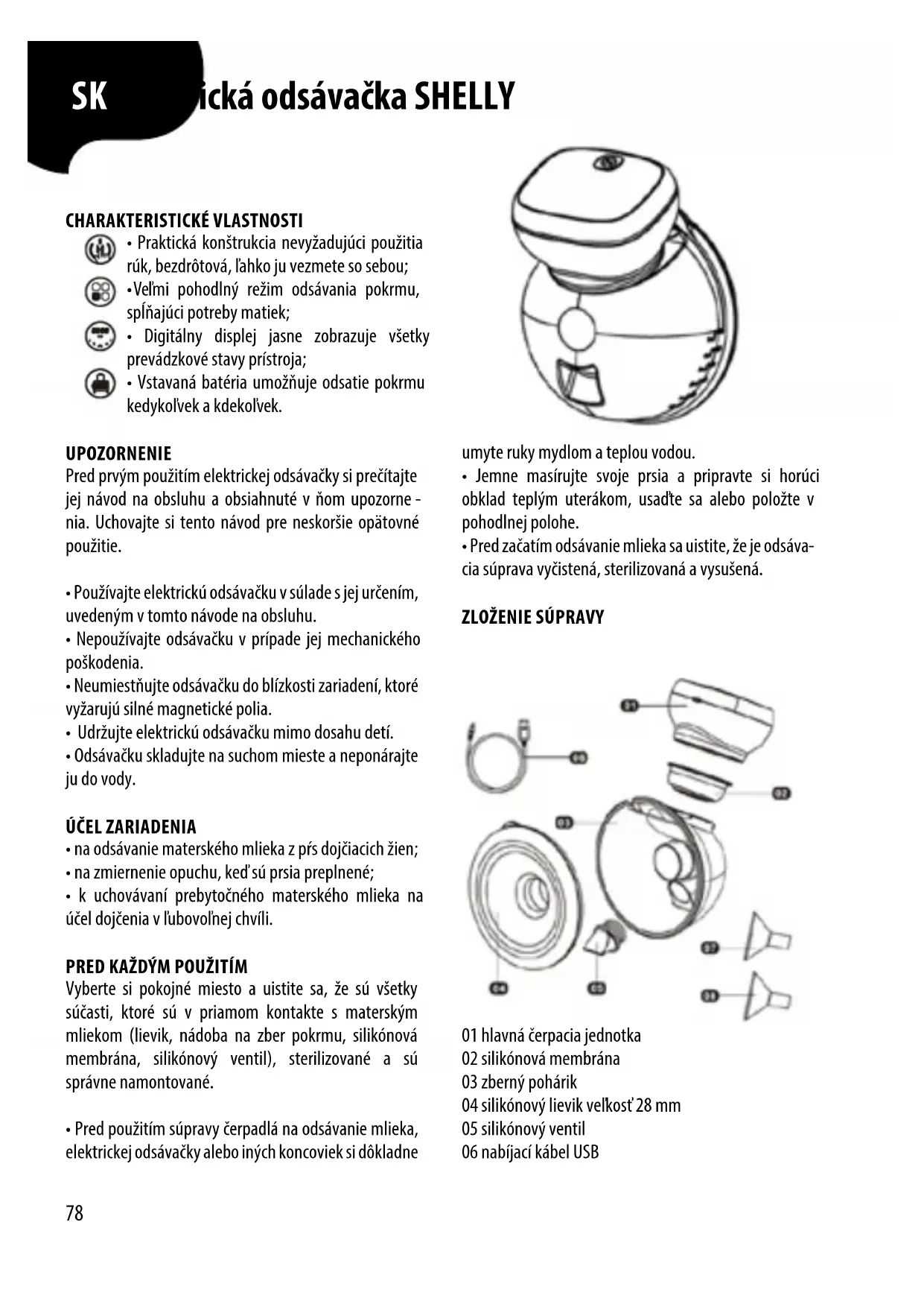 - Pred použitím súpravy čerpadlá na odsávanie mlieka, elektrickej odsávačky alebo iných koncoviek si dôkladne SK Elektrická odsávačka SHELLY umyte ruky mydlom a teplou vodou.