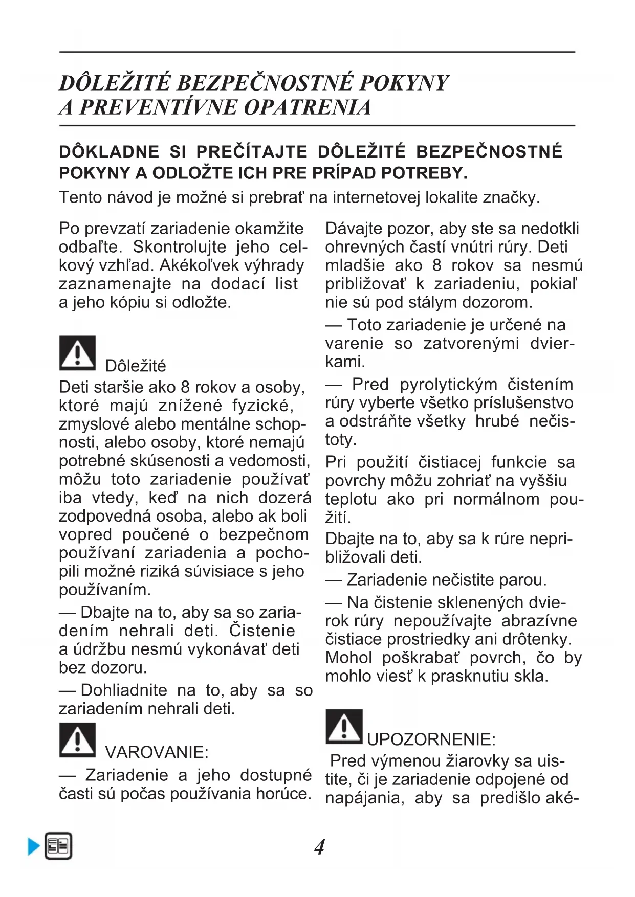 Po prevzatí zariadenie okamžite odbaľte. Skontrolujte jeho cel- kový vzhľad. Akékoľvek výhrady zaznamenajte na dodací list a jeho kópiu si odložte. Dôležité Deti staršie ako 8 rokov a osoby, ktoré majú znížené fyzické, zmyslové alebo mentálne schop- nosti, alebo osoby, ktoré nemajú potrebné skúsenosti a vedomosti, môžu toto zariadenie používať iba vtedy, keď na nich dozerá zodpovedná osoba, alebo ak boli vopred poučené o bezpečnom používaní zariadenia a pocho- pili možné riziká súvisiace s jeho používaním. — Dbajte na to, aby sa so zaria- dením nehrali deti. Čistenie a údržbu nesmú vykonávať deti bez dozoru. — Dohliadnite na to, aby sa so zariadením nehrali deti. VAROVANIE: — Zariadenie a jeho dostupné časti sú počas používania horúce. Dávajte pozor, aby ste sa nedotkli ohrevných častí vnútri rúry. Deti mladšie ako 8 rokov sa nesmú približovať k zariadeniu, pokiaľ nie sú pod stálym dozorom. — Toto zariadenie je určené na varenie so zatvorenými dvier- kami. — Pred pyrolytickým čistením rúry vyberte všetko príslušenstvo a odstráňte všetky hrubé nečis- toty. Pri použití čistiacej funkcie sa povrchy môžu zohriať na vyššiu teplotu ako pri normálnom pou- žití. Dbajte na to, aby sa k rúre nepri- bližovali deti. — Zariadenie nečistite parou. — Na čistenie sklenených dvie- rok rúry nepoužívajte abrazívne čistiace prostriedky ani drôtenky. Mohol poškrabať povrch, čo by mohlo viesť k prasknutiu skla. UPOZORNENIE: Pred výmenou žiarovky sa uis- tite, či je zariadenie odpojené od napájania, aby sa predišlo aké- DÔKLADNE SI PREČÍTAJTE DÔLEŽITÉ BEZPEČNOSTNÉ POKYNY A ODLOŽTE ICH PRE PRÍPAD POTREBY. Tento návod je možné si prebrať na internetovej lokalite značky.5