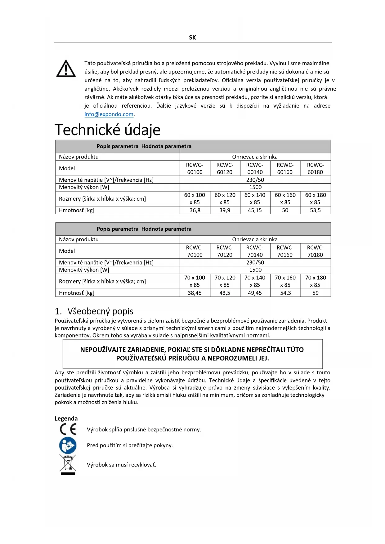 POZOR! Prečítajte si všetky bezpečnostné upozornenia a všetky pokyny. Nedodržanie upozornení a pokynov môže mať za následok úraz elektrickým prúdom, požiar a/alebo vážne zranenie alebo dokonca smrť. Pojmy "zariadenie" alebo "produkt" sa vo varovaniach a pokynoch používajú na označenie: Ohrievacia skrinka 2.1. Elektrická bezpečnosť a) Zástrčka musí pasovať do zásuvky. Zástrčku nijako neupravujte. Používanie originálnych zástrčiek a kompatibilných zásuviek znižuje riziko úrazu elektrickým prúdom. b) Kábel používajte len na určené účely. Nikdy ho nepoužívajte na prenášanie zariadenia ani na vytiahnutie zástrčky zo zásuvky. Kábel uchovávajte mimo dosahu zdrojov tepla, oleja, ostrých hrán alebo pohyblivých častí. Poškodené alebo zamotané káble zvyšujú riziko úrazu elektrickým prúdom. c) Ak sa nedá zabrániť používaniu zariadenia vo vlhkom prostredí, je potrebné použiť prúdový chránič (RCD). Použitie prúdového chrániča znižuje riziko úrazu elektrickým prúdom. d) Ak je napájací kábel poškodený alebo vykazuje zjavné známky opotrebovania, zariadenie nepoužívajte. Poškodený napájací kábel by mal vymeniť kvalifikovaný elektrikár alebo servisné stredisko výrobcu. e) Aby ste predišli úrazu elektrickým prúdom, neponárajte kábel, zástrčku ani zariadenie do vody alebo iných kvapalín. Zariadenie nepoužívajte na mokrých povrchoch. f) Nepoužívajte zariadenie vo veľmi vlhkom prostredí alebo v bezprostrednej blízkosti vodných nádrží. g) Zabráňte namočeniu zariadenia. Nebezpečenstvo úrazu elektrickým prúdom! h) Pred prvým použitím skontrolujte, či typ sieťového napätia a prúdu zodpovedá údajom na typovom štítku. 2.2. Bezpečnosť na pracovisku a) Postarajte sa o to, aby bolo pracovisko čisté a dobre osvetlené. Neporiadok alebo zlé osvetlenie môže viesť k nehodám. Pri práci so zariadením sa snažte myslieť dopredu, sledovať, čo sa deje, a používať zdravý rozum. b) Zariadenie nepoužívajte v prostredí s nebezpečenstvom výbuchu, napríklad v prítomnosti horľavých kvapalín, plynov alebo prachu. Zariadenie vytvára iskry, ktoré môžu zapáliť prach alebo výpary. c) Ak zistíte, že zariadenie je poškodené alebo má nepravidelnú prevádzku, okamžite ho vypnite a bezodkladne to nahláste svojmu nadriadenému. d) Ak máte pochybnosti o správnom fungovaní zariadenia, obráťte sa na podpornú službu výrobcu. e) Opravu zariadenia môže vykonávať iba servisné stredisko výrobcu. Nepokúšajte sa samostatne vykonávať opravy! f) V prípade požiaru použite na uhasenie práškový hasiaci prístroj alebo hasiaci prístroj s oxidom uhličitým (CO2)(určený na hasenie elektrických zariadení pod napätím). g) Zariadenie používajte v dobre vetranom priestore. h) Pravidelne kontrolujte stav bezpečnostných štítkov. Ak sú štítky nečitateľné, je potrebné ich vymeniť.