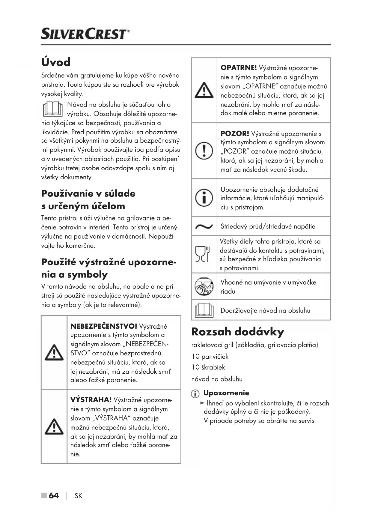 SK Úvod Srdečne vám gratulujeme ku kúpe vášho nového prístroja. Touto kúpou ste sa rozhodli pre výrobok vysokej kvality. Návod naobsluhu je súčasťou tohto výrobku. Obsahuje dôležité upozorne- nia týkajúce sa bezpečnosti, používania a likvidácie. Pred použitím výrobku sa oboznámte sovšetkými pokynmi na obsluhu a bezpečnostný- mi pokynmi. Výrobok používajte iba podľa opisu a vuvedených oblastiach použitia. Pri postúpení výrobku tretej osobe odovzdajte spolu sním aj všetky dokumenty. Používanie vsúlade surčeným účelom Tento prístroj slúži výlučne na grilovanie a pe- čenie potravín v interiéri. Tento prístroj je určený výlučne na používanie vdomácnosti. Nepouží- vajte ho komerčne. Použité výstražné upozorne- nia a symboly Vtomto návode na obsluhu, na obale a na prí- stroji sú použité nasledujúce výstražné upozorne- nia a symboly (ak je to relevantné): NEBEZPEČENSTVO! Výstražné upozornenie s týmto symbolom a signálnym slovom „NEBEZPEČEN- STVO“ označuje bezprostrednú nebezpečnú situáciu, ktorá, ak sa jej nezabráni, má za následok smrť alebo ťažké poranenie. VÝSTRAHA! Výstražné upozorne- nie s týmto symbolom a signálnym slovom „VÝSTRAHA“ označuje možnú nebezpečnú situáciu, ktorá, ak sa jej nezabráni, by mohla mať za následok smrť alebo ťažké porane- nie. OPATRNE! Výstražné upozorne- nie s týmto symbolom a signálnym slovom „OPATRNE“ označuje možnú nebezpečnú situáciu, ktorá, ak sa jej nezabráni, by mohla mať za násle- dok malé alebo mierne poranenie. POZOR! Výstražné upozornenie s týmto symbolom a signálnym slovom „POZOR“ označuje možnú situáciu, ktorá, ak sa jej nezabráni, by mohla mať za následok vecnú škodu. Upozornenie obsahuje dodatočné informácie, ktoré uľahčujú manipulá- ciu s prístrojom. Striedavý prúd/striedavé napätie Všetky diely tohto prístroja, ktoré sa dostávajú do kontaktu s potravinami, sú bezpečné z hľadiska používania s potravinami. Vhodné na umývanie v umývačke riadu Dodržiavajte návod na obsluhu Rozsah dodávky rakletovací gril (základňa, grilovacia platňa) 10 panvičiek 10 škrabiek návod na obsluhu Upozornenie ► Ihneď po vybalení skontrolujte, či je rozsah dodávky úplný a či nie je poškodený. Vprípade potreby sa obráťte na servis. IB_460256_SRGM1500B2_LB8.indb 64 11.06.2024 10:37:13SK
