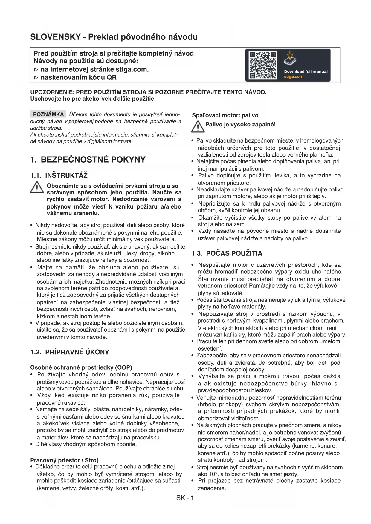 Предохранитель 5:A неисправен. Замените предохранитель 5:A. ПРИМЕЧАНИЕ Если после применения описанных спосо- бов устранения неполадки не устранены, обратитесь к свое- му дистрибьютору. ПРИМЕЧАНИЕ В случае других проблем, не указанных в таблице, немедленно обратитесь в авторизованный сервис- ный центр.SK - 1 Pred použitím stroja si prečítajte kompletný návod Návody na použitie sú dostupné: ▷ na internetovej stránke stiga.com. ▷ naskenovaním kódu QR Download full manual stiga.com SLOVENSKY - Preklad pôvodného návodu UPOZORNENIE: PRED POUŽITÍM STROJA SI POZORNE PREČÍTAJTE TENTO NÁVOD. Uschovajte ho pre akékoľvek ďalšie použitie. POZNÁMKA Účelom tohto dokumentu je poskytnúť jedno- duchý návod v papierovej podobe na bezpečné používanie a údržbu stroja. Ak chcete získať podrobnejšie informácie, stiahnite si komplet- né návody na použitie v digitálnom formáte.