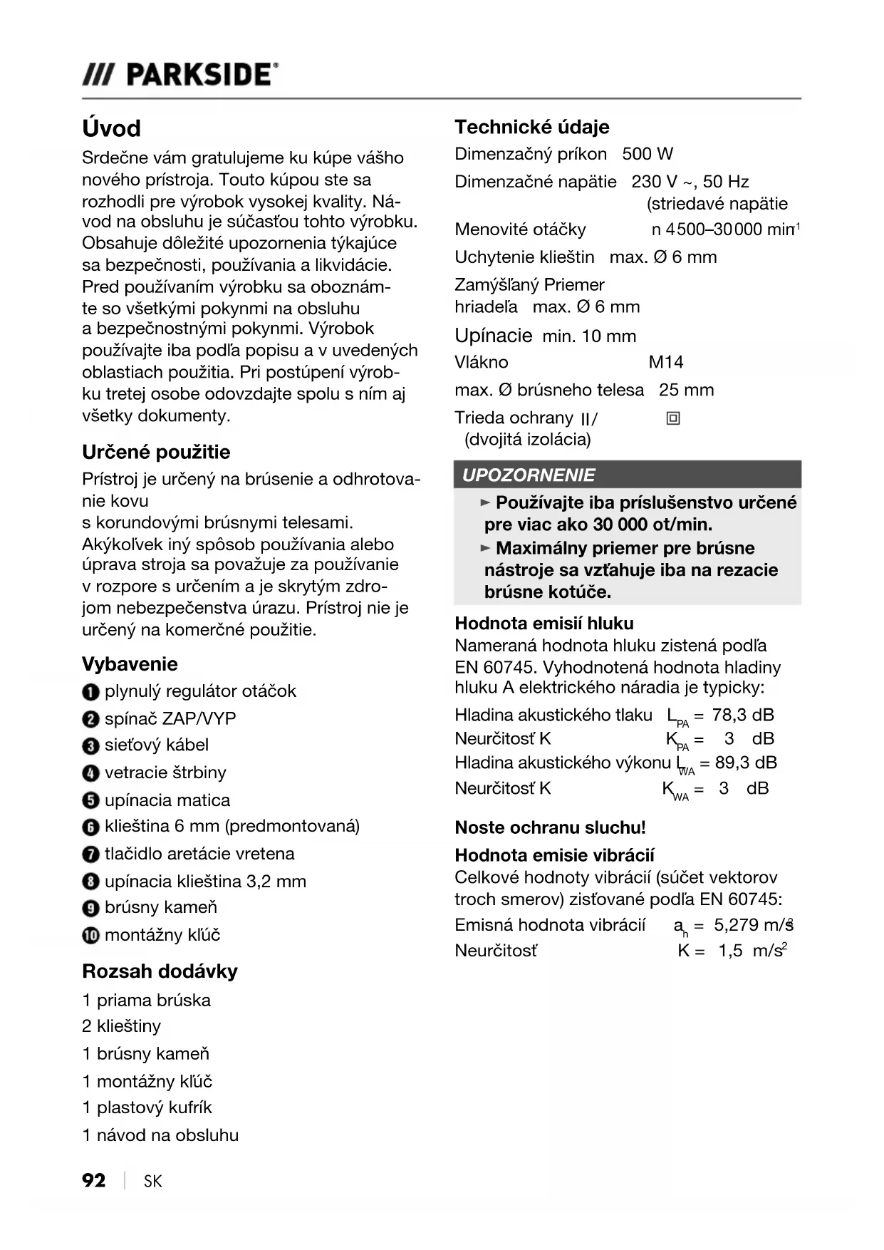 SK Úvod Srdečne vám gratulujeme kukúpe vášho nového prístroja. Touto kúpou ste sa rozhodli pre výrobok vysokej kvality. Ná- vod na obsluhu je súčasťou tohto výrobku. Obsahuje dôležité upozornenia týkajúce sa bezpečnosti, používania alikvidácie. Pred používaním výrobku sa oboznám- te sovšetkými pokynmi na obsluhu a bezpečnostnými pokynmi. Výrobok používajte iba podľa popisu a vuvedených oblastiach použitia. Pri postúpení výrob- ku tretej osobe odovzdajte spolu sním aj všetky dokumenty. Určené použitie Prístroj je určený na brúsenie a odhrotova- nie kovu s korundovými brúsnymi telesami. Akýkoľvek iný spôsob používaniaalebo úprava strojasapovažuje zapoužívanie vrozpore surčením aje skrytým zdro- jom nebezpečenstva úrazu. Prístroj nie je určený na komerčné použitie. Vybavenie plynulý regulátor otáčok spínač ZAP/VYP sieťový kábel vetracie štrbiny upínacia matica klieština 6 mm (predmontovaná) tlačidlo aretácie vretena upínacia klieština 3,2 mm brúsny kameň montážny kľúč Rozsah dodávky 1 priama brúska 2 klieštiny 1 brúsny kameň 1 montážny kľúč 1 plastový kufrík 1 návod na obsluhu Technické údaje Dimenzačný príkon 500 W Dimenzačné napätie 230 V ~, 50 Hz (striedavé napätie Menovité otáčky n 4 500–30 000 min