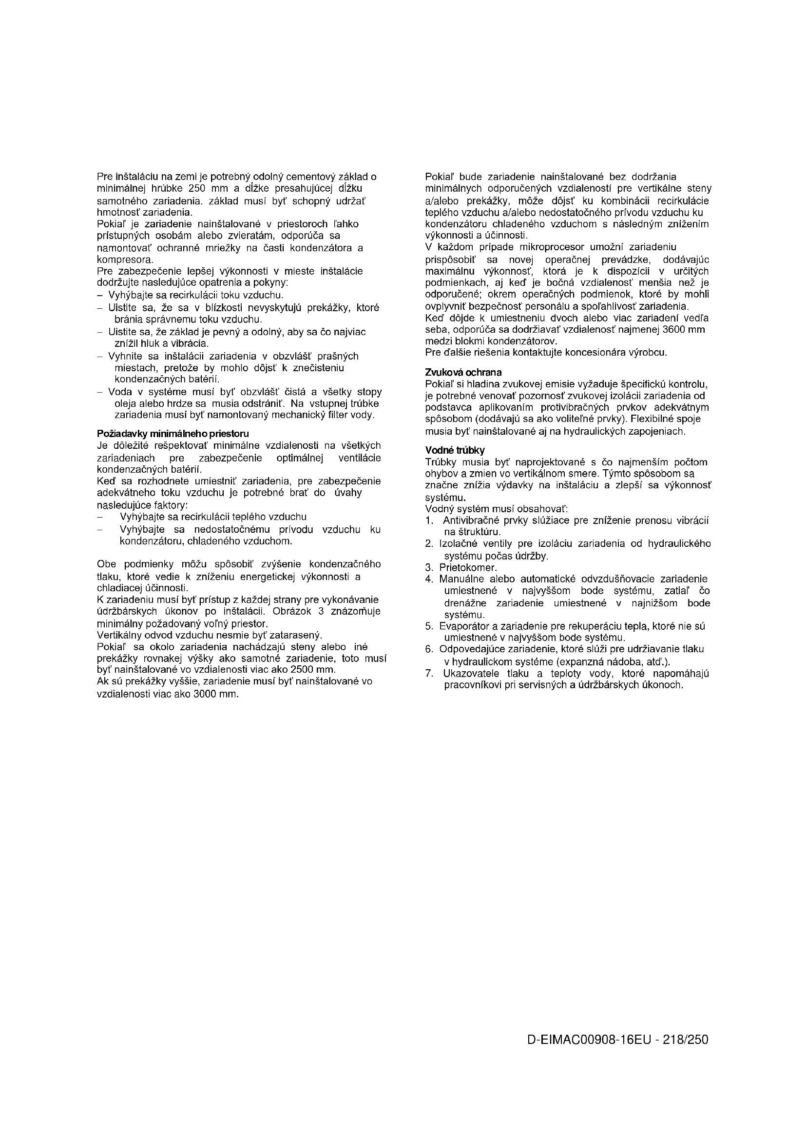 Zdvíhacie laná a posuvné tyče musia byť dostatočne pevné, aby zariadenie bezpečne udržali. Skontrolujte hmotnosť zariadenia na jeho identifikačnom štítku. Zariadenie sa musí zdvíhať s maximálnou opatrnosťou a pozornosťou, podľa pokynov pre zdvíhanie uvedených na štítku; zdvíhajte zariadenie veľmi pomaly a udržujte ho dokonale vyrovnané. Umiestnenie a montáž Všetky zariadenia sú projektované pre externé použitie, na balkónoch alebo zemi, za podmienok, že v priestore určenom pre inštaláciu sa nenachádzajú prekážky, ktoré by mohli znižovať prietok vzduchu ku kondenzačným batériám. Zariadenie musí byť nainštalované na pevnej a dokonale vyrovnanej základni; pokiaľ bude zariadenie nainštalované na balkónoch alebo strechách, je možné, že bude potrebné použiť trámy pre rozloženie hmotnosti.D-EIMAC00908-16EU - 217/250