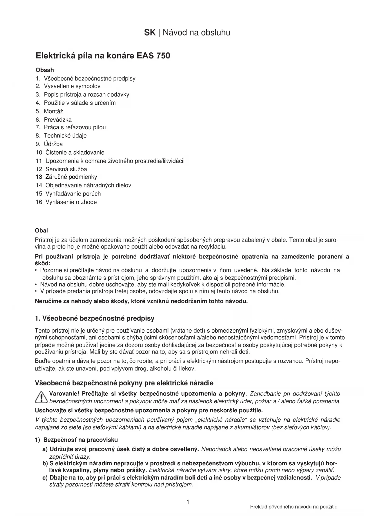 EAS 750 - Píla IKRA - Bezplatný návod na obsluhu