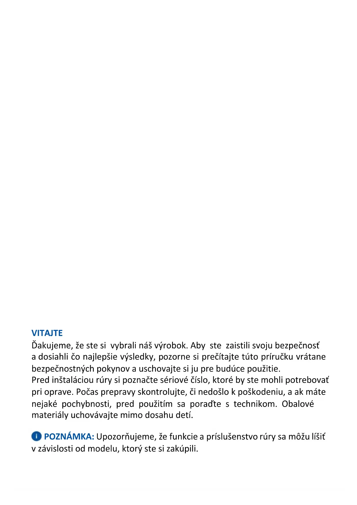 Rodapé Rodapé mmVITAJTE Ďakujeme, že ste si vybrali náš výrobok. Aby ste zaistili svoju bezpečnosť a dosiahli čo najlepšie výsledky, pozorne si prečítajte túto príručku vrátane bezpečnostných pokynov a uschovajte si ju pre budúce použitie. Pred inštaláciou rúry si poznačte sériové číslo, ktoré by ste mohli potrebovať pri oprave. Počas prepravy skontrolujte, či nedošlo k poškodeniu, a ak máte nejaké pochybnosti, pred použitím sa poraďte s technikom. Obalové materiály uchovávajte mimo dosahu detí. POZNÁMKA: Upozorňujeme, že funkcie a príslušenstvo rúry sa môžu líšiť v závislosti od modelu, ktorý ste si zakúpili.OBSAH
