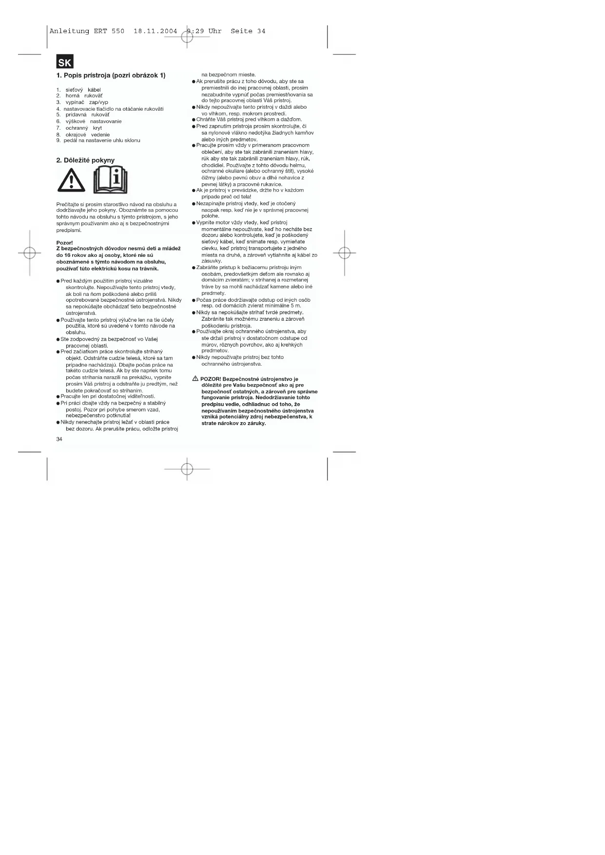 Anleitung ERT 550 18.11.2004 9:29 Uhr Seite 34 Nepokúšajte sa strihacie ústrojenstvo (nylonové vlákno) zastaviť pomocou rúk. Vždy počkajte dovtedy, až kým sa vlákno zastaví samo. Nepoužívajte nikdy žiadne iné ako originálne nylonové vlákno. Nepoužívajte na miesto nylonového vlákna v žiadnom prípade kovové drôty. Buďte opatrný a zabráňte tak zraneniam na zariadení, ktoré slúži na odrezávanie vlákna. Dbajte na to, aby boli vzduchové otvory zbavené od prípadných nečistôt. Vytiahnite po použití prístroja sieťový kábel zo zásuvky a skontrolujte, či sa na prístroji nenachádzajú poškodenia. Nepokúšajte sa pomocou tohto prístroja kosiť trávu, ktorá nerastie priamo zo zeme; nepokúšajte sa napríklad strihať trávu, ktorá rastie na múroch alebo na kameňoch, a pod. V pracovnej oblasti elektrickej kosy na trávnik je obsluhujúca osoba zodpovedná voči tretím osobám za škody, ktoré sú spôsobené používaním tohto prístroja. Neprechádzajte so zapnutým prístrojom cez cesty alebo štrkové chodníky. Keď prístroj momentálne nepoužívate, uskladnite ho na suchom mieste mimo dosahu detí. Používajte tento prístroj len takým spôsobom, ako je určené v tomto návode na obsluhu a držte ho vždy kolmo k zemi. Každá iná poloha je nebezpečná. Pravidelne kontrolujte, či sú všetky skrutky správne dotiahnuté. Sieťové napätie sa musí zhodovať s napätím, ktoré je uvedené na výrobnom štítku s údajmi. Prípojné vedenie musí byť pravidelne kontrolované, či sa na ňom nenachádzajú príznaky poškodenia alebo starnutia. Prístroj nesmie byť používaný, ak stav prípojného vedenia nie je v bezchybnom stave. Prípojné vedenie nesmie byť ľahšie ako ľahké vedenie s gumenou izoláciou HO7RN-F podľa DIN 57282/VDE 0282 a musia mať minimálny prierez 1,5 mm