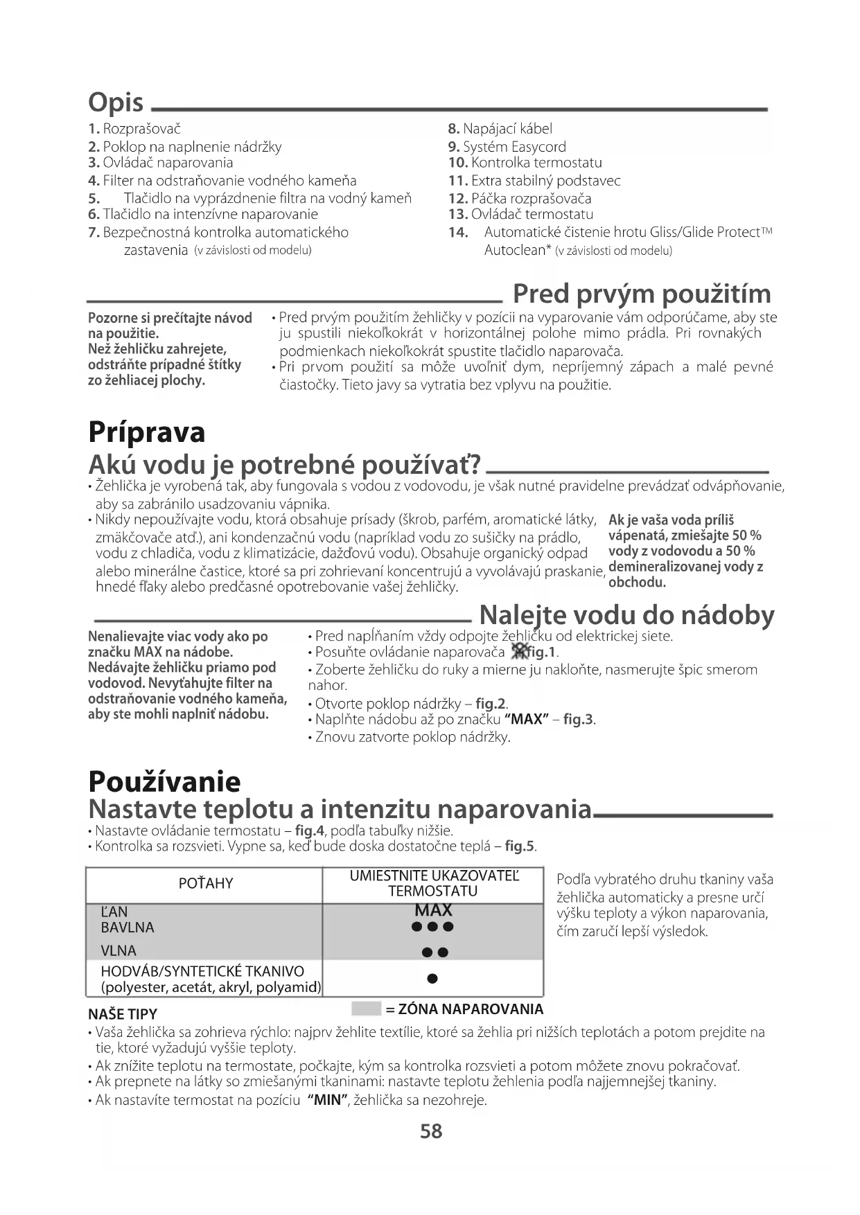 - Nastavte teplotu podľa textílie, ktorú chcete žehliť.• Posuňte ovládanie naparovača do polohy – fig.1.• Keď sa kontrolka rozsvieti, môžete žehliť. Doplnkové funkcie Automatické čistenie hrotu Gliss/Glide Protect