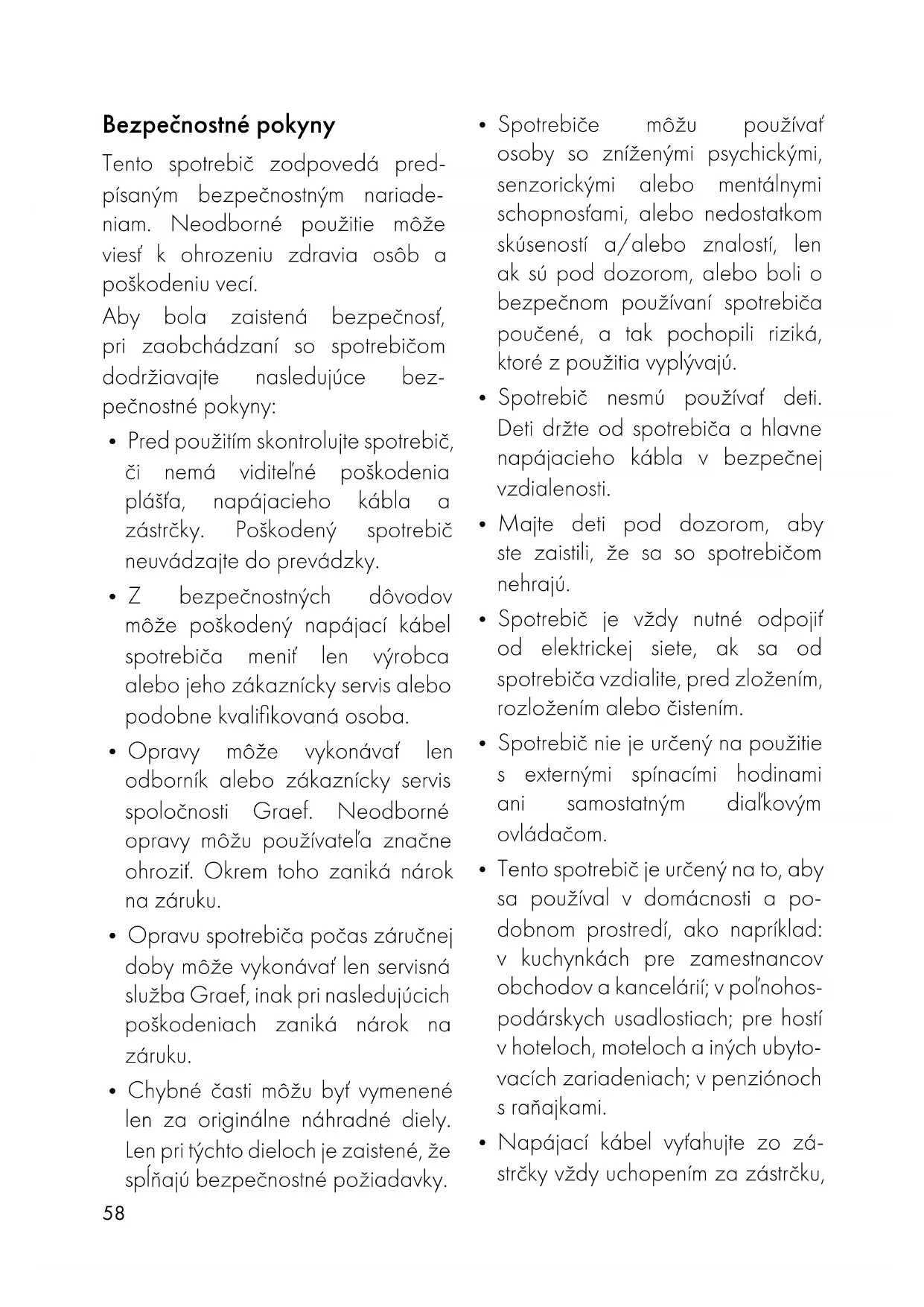 - Opravu spotrebiča počas záručnej doby môže vykonávať len servisná služba Graef, inak pri nasledujúcich poškodeniach zaniká nárok na záruku.