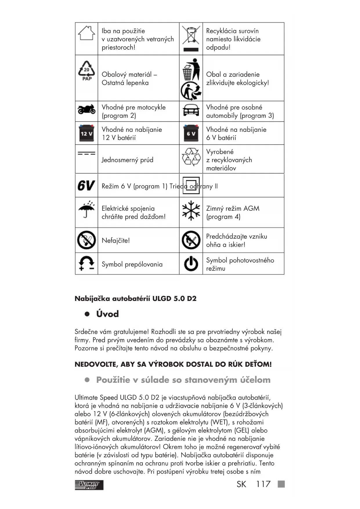 Iba na použitie v uzatvorených vetraných priestoroch! Recyklácia surovín namiesto likvidácie odpadu! Obalový materiál – Ostatná lepenka Obal a zariadenie zlikvidujte ekologicky! Vhodné pre motocykle (program 2) Vhodné pre osobné automobily (program 3) Vhodné na nabíjanie 12 V batérií Vhodné na nabíjanie 6 V batérií Jednosmerný prúd Vyrobené zrecyklovaných materiálov Režim 6 V (program 1) Trieda ochrany II Elektrické spojenia chráňte pred dažďom! Zimný režim AGM (program 4) Nefajčite! Predchádzajte vzniku ohňa a iskier! Symbol prepólovania Symbol pohotovostného režimu Nabíjačka autobatérií ULGD 5.0 D2 z Úvod Srdečne vám gratulujeme! Rozhodli ste sa pre prvotriedny výrobok našej firmy. Pred prvým uvedením do prevádzky sa oboznámte s výrobkom. Pozorne si prečítajte tento návod na obsluhu a bezpečnostné pokyny. NEDOVOĽTE, ABY SA VÝROBOK DOSTAL DO RÚK DEŤOM! z Použitie v súlade sostanoveným účelom Ultimate Speed ULGD 5.0 D2 je viacstupňová nabíjačka autobatérií, ktorá je vhodná na nabíjanie a udržiavacie nabíjanie 6 V (3-článkových) alebo 12 V (6-článkových) olovených akumulátorov (bezúdržbových batérií (MF), otvorených) s roztokom elektrolytu (WET), s rohožami absorbujúcimi elektrolyt (AGM), s gélovým elektrolytom (GEL) alebo vápnikových akumulátorov. Zariadenie nie je vhodné na nabíjanie lítiovo-iónových akumulátorov! Okrem toho je možné regenerovať vybité batérie (v závislosti od typu batérie). Nabíjačka autobatérií disponuje ochranným spínaním na ochranu proti tvorbe iskier a prehriatiu. Tento návod dobre uschovajte. Pri postúpení výrobku tretej osobe sním 497453_2204_Kfz-Ladegerat ULGD 5_0 D2_content_LB8.indb 117497453_2204_Kfz-Ladegerat ULGD 5_0 D2_content_LB8.indb 117 27.06.22 11:1327.06.22 11:13118