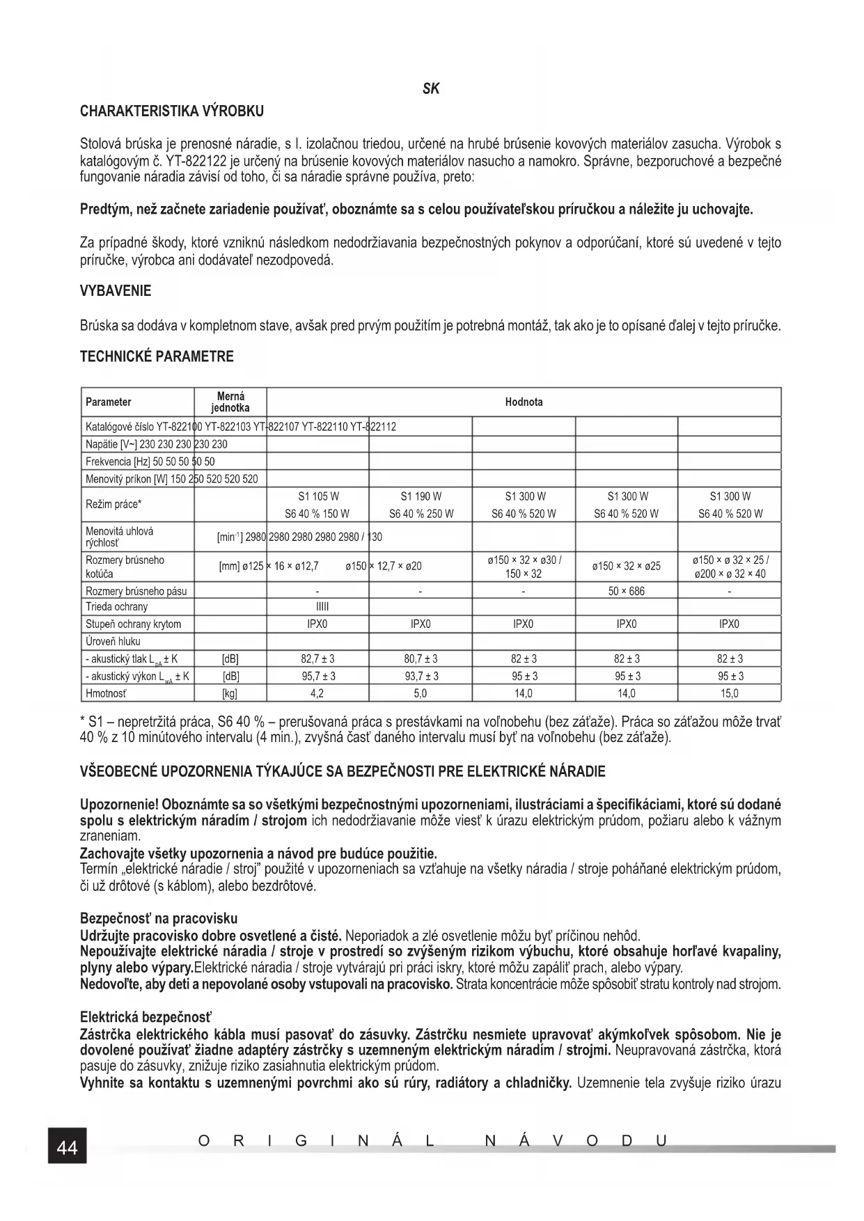 Stolová brúska je prenosné náradie, s I. izolačnou triedou, určené na hrubé brúsenie kovových materiálov zasucha. Výrobok s katalógovým č. YT-822122 je určený na brúsenie kovových materiálov nasucho a namokro. Správne, bezporuchové a bezpečné fungovanie náradia závisí od toho, či sa náradie správne používa, preto: Predtým, než začnete zariadenie používať, oboznámte sa s celou používateľskou príručkou a náležite ju uchovajte. Za prípadné škody, ktoré vzniknú následkom nedodržiavania bezpečnostných pokynov a odporúčaní, ktoré sú uvedené v tejto príručke, výrobca ani dodávateľ nezodpovedá. VYBAVENIE Brúska sa dodáva v kompletnom stave, avšak pred prvým použitím je potrebná montáž, tak ako je to opísané ďalej v tejto príručke. TECHNICKÉ PARAMETRE Parameter Merná jednotka Hodnota Katalógové číslo YT-822100 YT-822103 YT-822107 YT-822110 YT-822112 Napätie [V~] 230 230 230 230 230 Frekvencia [Hz] 50 50 50 50 50 Menovitý príkon [W] 150 250 520 520 520 Režim práce* S1 105 W S6 40 % 150 W S1 190 W S6 40 % 250 W S1 300 W S6 40 % 520 W S1 300 W S6 40 % 520 W S1 300 W S6 40 % 520 W Menovitá uhlová rýchlosť [min