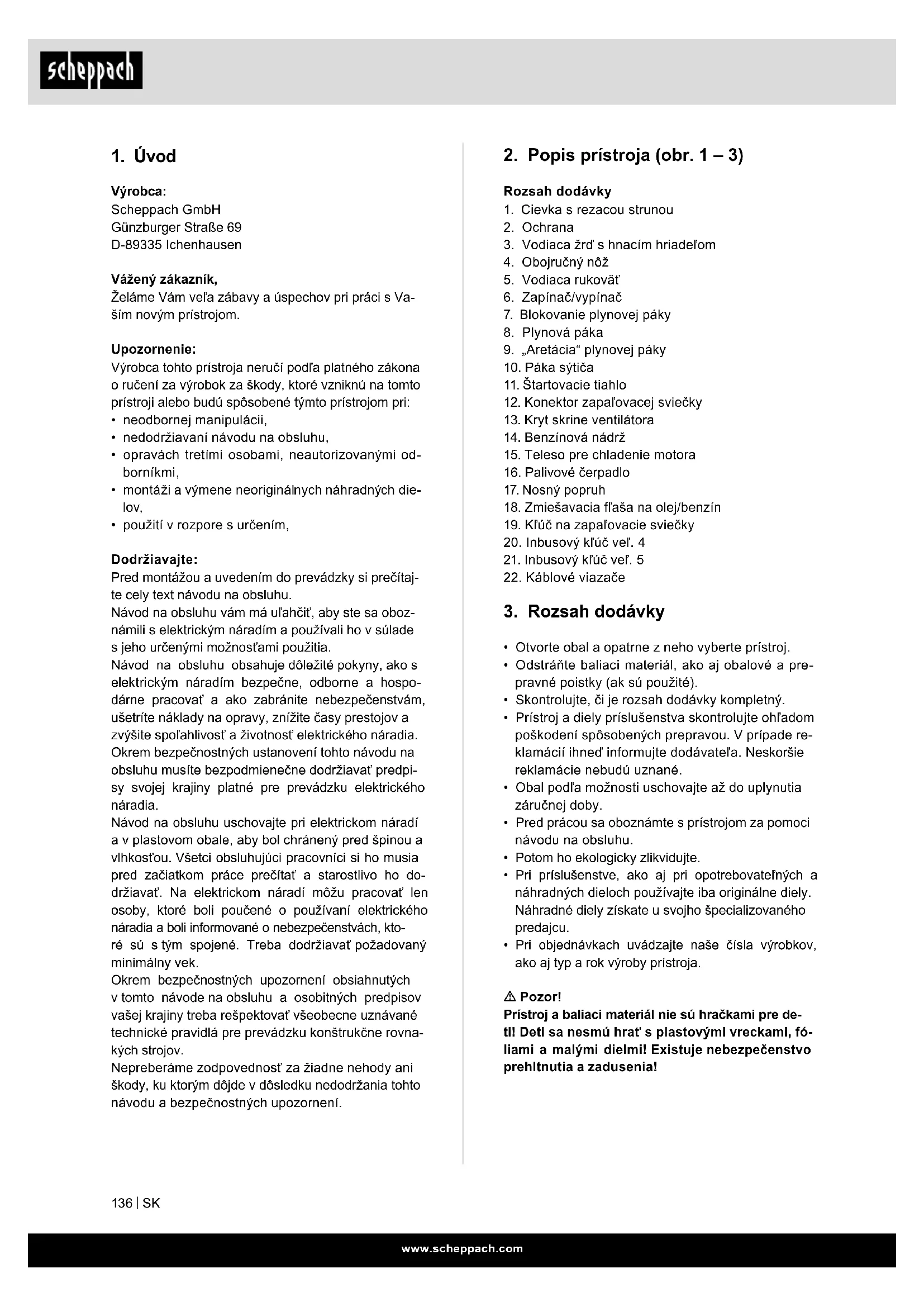 - použití v rozpore s určením, Dodržiavajte: Pred montážou a uvedením do prevádzky si prečítaj- te cely text návodu na obsluhu. Návod na obsluhu vám má uľahčiť, aby ste sa oboz- námili s elektrickým náradím a používali ho v súlade s jeho určenými možnosťami použitia. Návod na obsluhu obsahuje dôležité pokyny, ako s elektrickým náradím bezpečne, odborne a hospo- dárne pracovať a ako zabránite nebezpečenstvám, ušetríte náklady na opravy, znížite časy prestojov a zvýšite spoľahlivosť a životnosť elektrického náradia. Okrem bezpečnostných ustanovení tohto návodu na obsluhu musíte bezpodmienečne dodržiavať predpi- sy svojej krajiny platné pre prevádzku elektrického náradia. Návod na obsluhu uschovajte pri elektrickom náradí a v plastovom obale, aby bol chránený pred špinou a vlhkosťou. Všetci obsluhujúci pracovníci si ho musia pred začiatkom práce prečítať a starostlivo ho do- držiavať. Na elektrickom náradí môžu pracovať len osoby, ktoré boli poučené o používaní elektrického náradia a boli informované o nebezpečenstvách, kto- ré sú s tým spojené. Treba dodržiavať požadovaný minimálny vek. Okrem bezpečnostných upozornení obsiahnutých v tomto návode na obsluhu a osobitných predpisov vašej krajiny treba rešpektovať všeobecne uznávané technické pravidlá pre prevádzku konštrukčne rovna- kých strojov. Nepreberáme zodpovednosť za žiadne nehody ani škody, ku ktorým dôjde v dôsledku nedodržania tohto návodu a bezpečnostných upozornení.www.scheppach.com