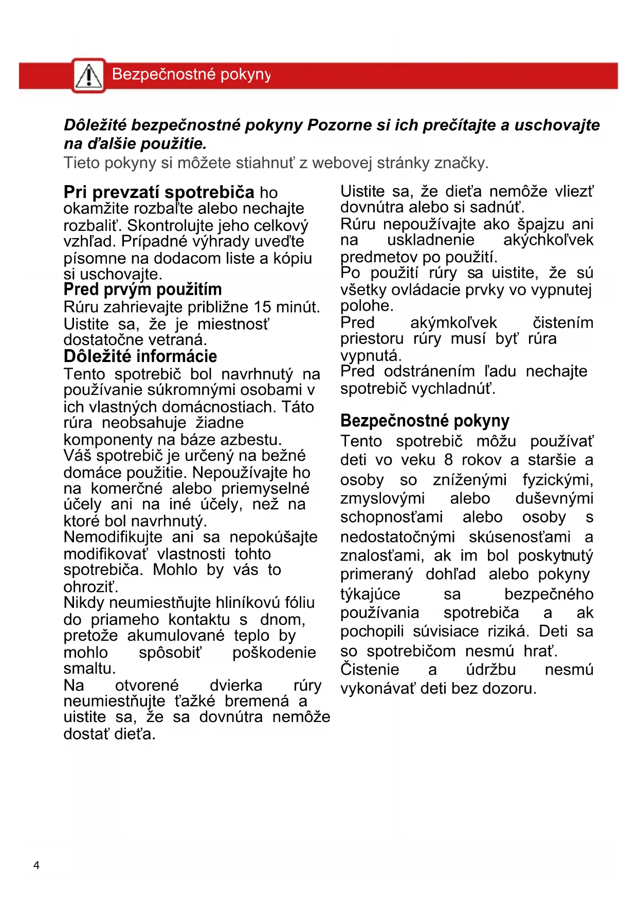Dôležité bezpečnostné pokyny Pozorne si ich prečítajte a uschovajte na ďalšie použitie. Tieto pokyny si môžete stiahnuť z webovej stránky značky. Pri prevzatí spotrebiča ho okamžite rozbaľte alebo nechajte rozbaliť. Skontrolujte jeho celkový vzhľad. Prípadné výhrady uveďte písomne na dodacom liste a kópiu si uschovajte. Pred prvým použitím Rúru zahrievajte približne 15 minút. Uistite sa, že je miestnosť dostatočne vetraná. Dôležité informácie Tento spotrebič bol navrhnutý na používanie súkromnými osobami v ich vlastných domácnostiach. Táto rúra neobsahuje žiadne komponenty na báze azbestu. Váš spotrebič je určený na bežné domáce použitie. Nepoužívajte ho na komerčné alebo priemyselné účely ani na iné účely, než na ktoré bol navrhnutý. Nemodifikujte ani sa nepokúšajte modifikovať vlastnosti tohto spotrebiča. Mohlo by vás to ohroziť. Nikdy neumiestňujte hliníkovú fóliu do priameho kontaktu s dnom, pretože akumulované teplo by mohlo spôsobiť poškodenie smaltu. Na otvorené dvierka rúry neumiestňujte ťažké bremená a uistite sa, že sa dovnútra nemôže dostať dieťa. Uistite sa, že dieťa nemôže vliezť dovnútra alebo si sadnúť. Rúru nepoužívajte ako špajzu ani na uskladnenie akýchkoľvek predmetov po použití. Po použití rúry sa uistite, že sú všetky ovládacie prvky vo vypnutej polohe. Pred akýmkoľvek čistením priestoru rúry musí byť rúra vypnutá. Pred odstránením ľadu nechajte spotrebič vychladnúť. Bezpečnostné pokyny Tento spotrebič môžu používať deti vo veku 8 rokov a staršie a osoby so zníženými fyzickými, zmyslovými alebo duševnými schopnosťami alebo osoby s nedostatočnými skúsenosťami a znalosťami, ak im bol poskytnutý primeraný dohľad alebo pokyny týkajúce sa bezpečného používania spotrebiča a ak pochopili súvisiace riziká. Deti sa so spotrebičom nesmú hrať. Čistenie a údržbu nesmú vykonávať deti bez dozoru.5 Bezpečnostné pokyny