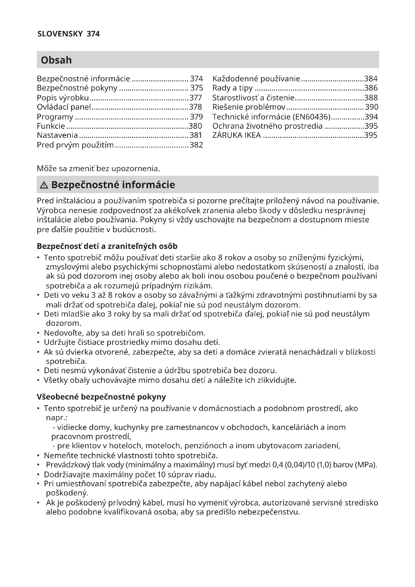 - pokynmi na montáž a bezpečnostnými opatreniami uvedenými v návode na používanie.SLOVENSKY 397 Špecializovanýpopredajnýservispre spotrebičeIKEA: Neváhajte a kontaktujte popredajný servis spoločnosti IKEA a: požiadajte o servis v rámci tejto záruky; požiadajte o vysvetlenie inštalácie spotrebiča IKEA do určeného kuchynského nábytku IKEA. Servis neposkytuje vysvetlenia týkajúce sa: celkovej inštalácie kuchyne IKEA; celkovej inštalácie kuchyne IKEA; pripojenia k elektrine (ak je spotrebič dodávaný bez zástrčky a kábla), k vode a plynu, pretože ich musí vykonať autorizovaný servisný technik. Požiadajte o objasnenie obsahu návodu na používanie a špecikácií spotrebiča IKEA. Aby ste sa uistili, že vám poskytneme najlepšiu pomoc, prečítajte si pozorne pokyny na montáž a/alebo návod na používanie v tejto brožúre, skôr ako nás budete kontaktovať. Dostupnosťnáhradnýchdielov Nasledujúce diely budú k dispozícii 7rokov po ukončení výroby tohto modelu: motor; obehové a vypúšťacie čerpadlo; ohrievače a vykurovacie články vrátane tepelných čerpadiel (samostatne alebo v zostavách); potrubia a súvisiace vybavenie vrátane všetkých hadíc, ventilov, ltrov a systémov „Aquastop“; konštrukčné a interiérové časti súvisiace so zostavami dverí (samostatne alebo v zostavách); dosky s plošnými spojmi; elektronické displeje; tlakové spínače; termostaty a snímače; softvér a rmvér vrátane resetovacieho softvéru. Nasledujúce diely budú k dispozícii 10rokov po ukončení výroby tohto modelu: záves a tesnenie dverí, ďalšie tesnenia, ostrekovacie ramená, odtokové ltre, interiérové police a plastové príslušenstvo, ako sú koše a veká. Vo veci objednania náhradných dielov sa obráťte na popredajný servis spoločnosti IKEA. Ako nás nájdete, ak potrebujete náš servis Úplný zoznam poskytovateľov kontaktov, ktorých určila spoločnosť IKEA, a príslušných vnútroštátnych telefónnych čísel nájdete na poslednej strane tejto príručky. Aby sme vám mohli poskytnúť rýchlejší servis, odporúčame vám používať konkrétne telefónne čísla uvedené na konci tohto návodu. Vždy sa riaďte číslami uvedenými v brožúre konkrétneho spotrebiča, v prípade ktorého potrebujete pomoc. Predtým, ako nám zavoláte, sa uistite, že máte poruke číslo výrobku IKEA (8-ciferný kód) a sériové číslo (8-ciferný kód, ktorý je uvedený na typovom štítku) pre spotrebič, v prípade ktorého potrebujete pomoc. ODLOŽTESIPOKLADNIČNÝBLOK!Je to doklad o nákupe a budete ho potrebovať pri požiadaní o záručnú opravu. Upozorňujeme, že názov a číslo výrobku IKEA (8-ciferný kód) každého zakúpeného spotrebiča sú uvedené na pokladničnom bloku. Potrebujetenejakúďalšiupomoc? Ak máte akékoľvek ďalšie otázky, ktoré sa netýkajú popredajného servisu spotrebičov, kontaktujte naše najbližšie call centrum IKEA. Odporúčame vám zoznámiť sa podrobne s dokumentáciou výrobku pred tým, než sa na nás obrátite.LIETUVIŲ 398 Turinys Gali būti pakeista be įspėjimo. Saugos informacija Prieš montuodami ir naudodami aparatą, atidžiai perskaitykite pateiktas instrukcijas. Gamintojas neatsako už jokius sužalojimus ar žalą, kilusią dėl neteisingo įrengimo ar naudojimo. Laikykite šias instrukcijos saugioje ir patogioje vietoje, kad prireikus galėtumėte peržiūrėti. Vaikųirpažeidžiamųžmoniųsaugumas