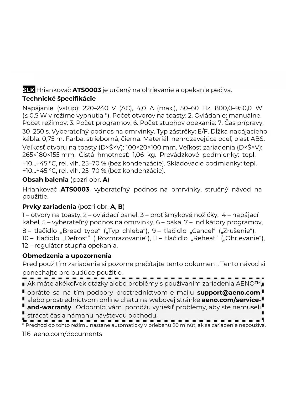 Тосты застряли. Возможная причина: ломтик хлеба слишком большой. Решение: отключите устройство от источника питания и извлеките тосты силиконовыми или пластиковыми кухонными щипцами. ВНИМАНИЕ! Не используйте металлические предметы (ножи, вилки, ложки и т.д.) для извлечения тостов. ВНИМАНИЕ! Если ни один из предложенных способов не помог устранить проблему, обратитесь к поставщику либо в авторизованный сервисный центр. Не разбирайте устройство и не пытайтесь отремонтировать его самостоятельно.116 aeno.com/documents SLK Hriankovač ATS0003 je určený na ohrievanie a opekanie pečiva. Technické špecifikácie Napájanie (vstup): 220–240 V (AC), 4,0 A (max.), 50–60 Hz, 800,0–950,0 W (≤ 0,5 W v režime vypnutia *). Počet otvorov na toasty: 2. Ovládanie: manuálne. Počet režimov: 3. Počet programov: 6. Počet stupňov opekania: 7. Čas prípravy: 30–250 s. Vyberateľný podnos na omrvinky. Typ zástrčky: E/F. Dĺžka napájacieho kábla: 0,75 m. Farba: strieborná, čierna. Materiál: nehrdzavejúca oceľ, plast ABS. Veľkosť otvoru na toasty (D׊×V): 100×20×100 mm. Veľkosť zariadenia (D׊×V): 265×180×155 mm. Čistá hmotnosť: 1,06 kg. Prevádzkové podmienky: tepl. +10…+45 °C, rel. vlh. 25–70 % (bez kondenzácie). Skladovacie podmienky: tepl. +10…+45 °C, rel. vlh. 25–70 % (bez kondenzácie). Obsah balenia (pozri obr. A) Hriankovač ATS0003, vyberateľný podnos na omrvinky, stručný návod na použitie. Prvky zariadenia (pozri obr. A, B) 1 – otvory na toasty, 2 – ovládací panel, 3 – protišmykové nožičky, 4 – napájací kábel, 5 – vyberateľný podnos na omrvinky, 6 – páka, 7 – indikátory programov, 8 – tlačidlo „Bread type“ („Typ chleba“), 9 – tlačidlo „Cancel“ („Zrušenie“), 10 – tlačidlo „Defrost“ („Rozmrazovanie“), 11 – tlačidlo „Reheat“ („Ohrievanie“), 12 – regulátor stupňa opekania. Obmedzenia a upozornenia Pred použitím zariadenia si pozorne prečítajte tento dokument. Tento návod si ponechajte pre budúce použitie.