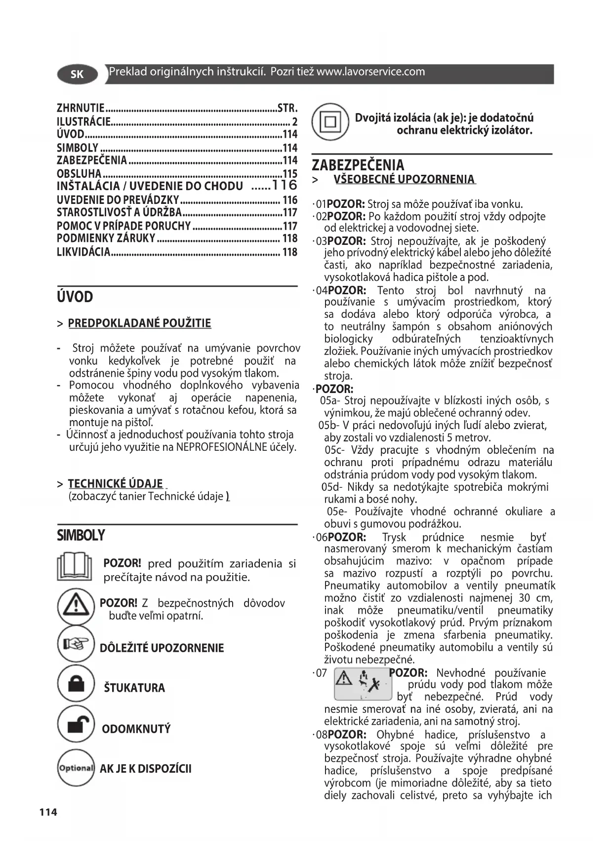 - Stroj môžete používať na umývanie povrchov vonku kedykoľvek je potrebné použiť na odstránenie špiny vodu pod vysokým tlakom. - Pomocou vhodného doplnkového vybavenia môžete vykonať aj operácie napenenia, pieskovania a umývať s rotačnou kefou, ktorá sa montuje na pištoľ. - Účinnosť a jednoduchosť používania tohto stroja určujú jeho využitie na NEPROFESIONÁLNE účely. > TECHNICKÉ ÚDAJE (zobaczyć tanier Technické údaje ) SIMBOLY