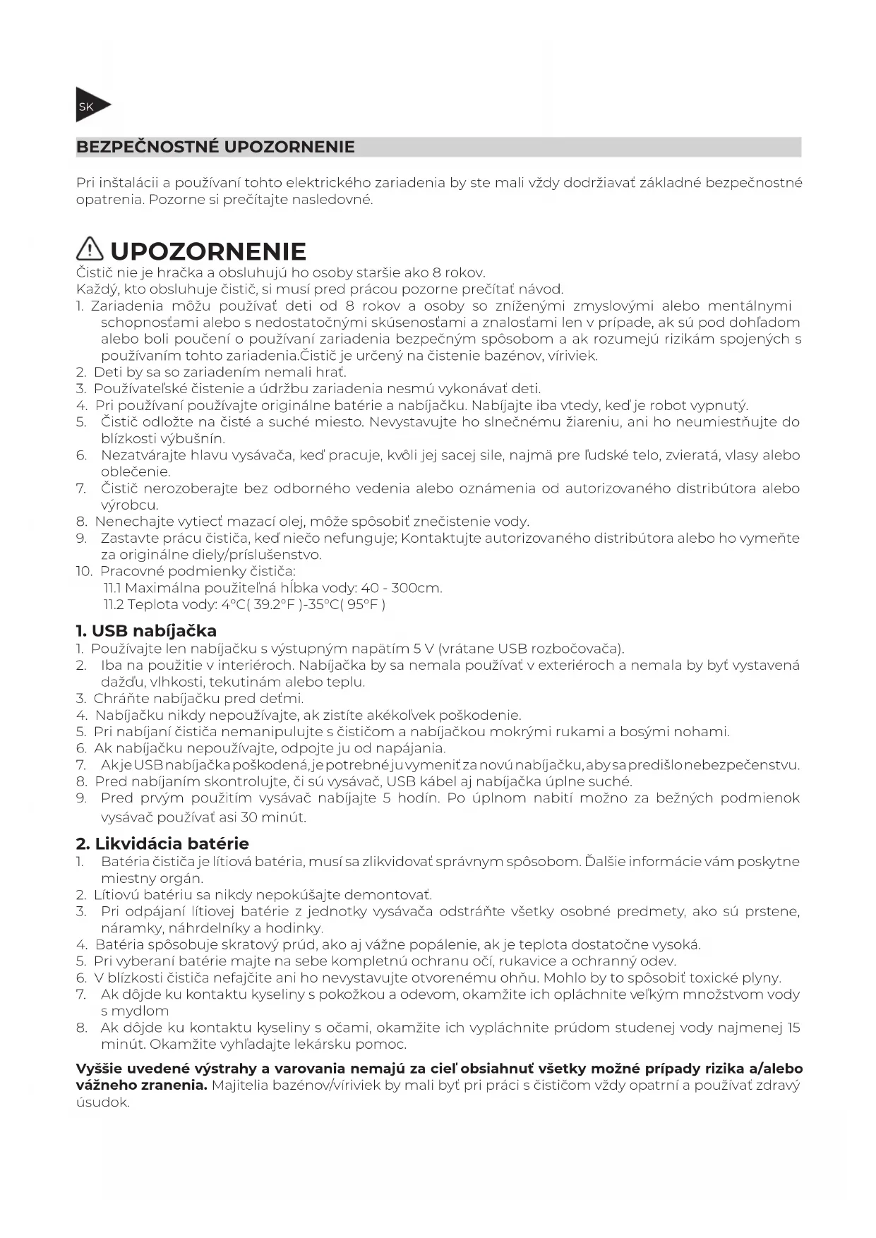 minút. Okamžite vyhľadajte lekársku pomoc. Vyššie uvedené výstrahy a varovania nemajú za cieľ obsiahnuť všetky možné prípady rizika a/alebo vážneho zranenia. Majitelia bazénov/víriviek by mali byť pri práci s čističom vždy opatrní a používať zdravý úsudok.SK