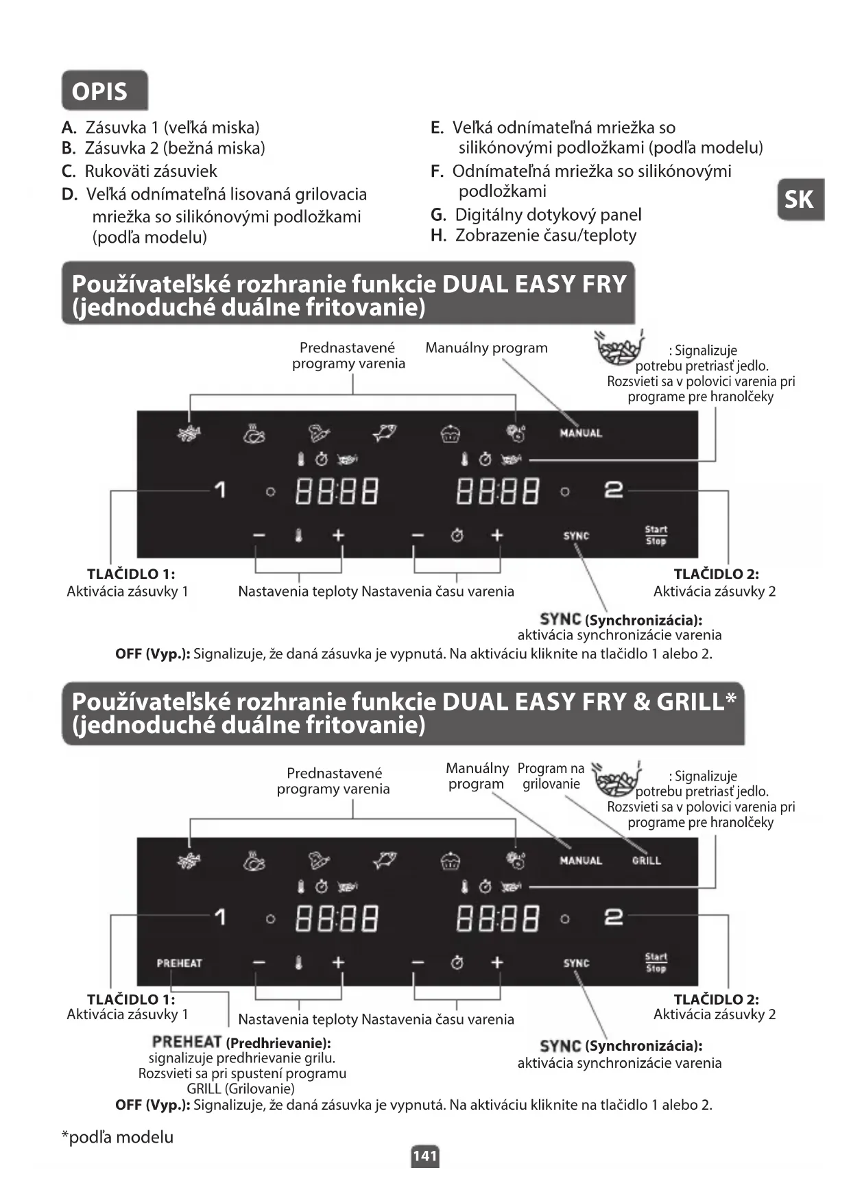 OPIS A. Zásuvka 1 (veľká miska) B. Zásuvka 2 (bežná miska) C. Rukoväti zásuviek D. Veľká odnímateľná lisovaná grilovacia mriežka so silikónovými podložkami (podľa modelu) E. Veľká odnímateľná mriežka so silikónovými podložkami (podľa modelu) F. Odnímateľná mriežka so silikónovými podložkami G. Digitálny dotykový panel H. Zobrazenie času/teploty Používateľské rozhranie funkcie DUAL EASY FRY (jednoduché duálne fritovanie) Používateľské rozhranie funkcie DUAL EASY FRY & GRILL* (jednoduché duálne fritovanie) OFF (Vyp.): Signalizuje, že daná zásuvka je vypnutá. Na aktiváciu kliknite na tlačidlo 1 alebo 2. (Predhrievanie): signalizuje predhrievanie grilu. Rozsvieti sa pri spustení programu GRILL (Grilovanie) *podľa modelu Prednastavené programy varenia Manuálny program (Synchronizácia): aktivácia synchronizácie varenia Nastavenia teploty Nastavenia času varenia TLAČIDLO 1: Aktivácia zásuvky 1 TLAČIDLO 2: Aktivácia zásuvky 2 Program na grilovanie OFF (Vyp.): Signalizuje, že daná zásuvka je vypnutá. Na aktiváciu kliknite na tlačidlo 1 alebo 2. Prednastavené programy varenia : Signalizuje potrebu pretriasť jedlo. Rozsvieti sa v polovici varenia pri programe pre hranolčeky : Signalizuje potrebu pretriasť jedlo. Rozsvieti sa v polovici varenia pri programe pre hranolčeky Manuálny program (Synchronizácia): aktivácia synchronizácie varenia Nastavenia teploty Nastavenia času varenia TLAČIDLO 1: Aktivácia zásuvky 1 TLAČIDLO 2: Aktivácia zásuvky 2SK