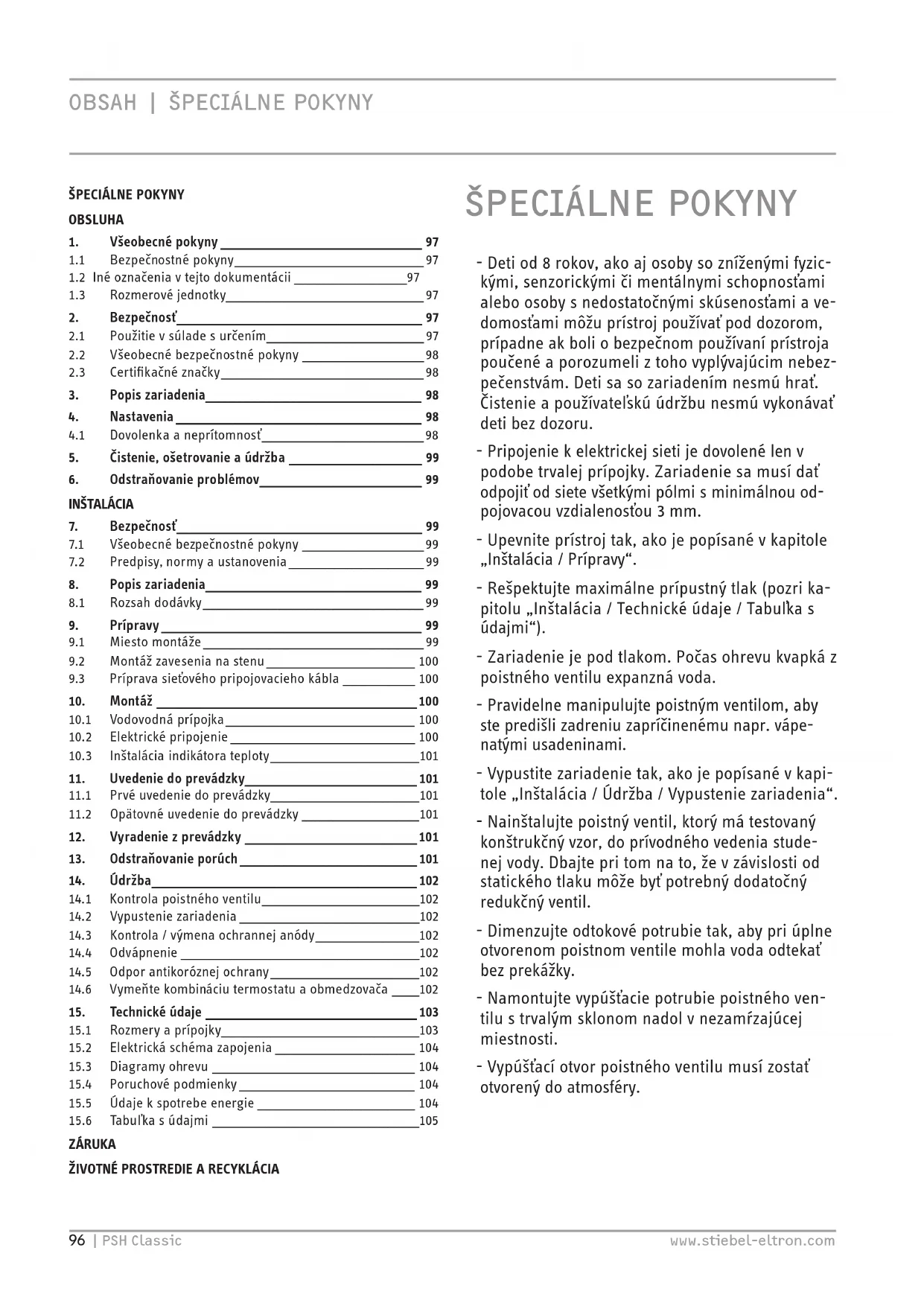 Záruka Pre zariadenia nadobudnuté mimo Nemecka neplatia záruč- né podmienky našich nemeckých spoločností. V krajinách, v ktorých existuje jedna z našich dcérskych spoločností predá- vajúcich naše výrobky, sa skôr poskytuje záruka iba od tejto dcérskej spoločnosti. Takáto záruka je poskytnutá iba vtedy, keď dcérska spoločnosť vydala vlastné záručné podmienky. Nad rámec uvedeného sa záruka neposkytuje. Na zariadenia, ktoré boli nadobudnuté v krajinách, v ktorých naše výrobky nepredáva žiadna z našich dcérskych spoločnos- tí, záruku neposkytujeme. Prípadné záruky prisľúbené dovoz- com zostávajú týmto nedotknuté. Životné prostredie a recyklácia Pomôžte chrániť naše životné prostredie. Balenie prístroja je nutné zlikvidovať v súlade s vnútroštátnymi predpismi a usta- noveniami o likvidácii odpadov.106 | PSH Classic www.stiebel-eltron.com