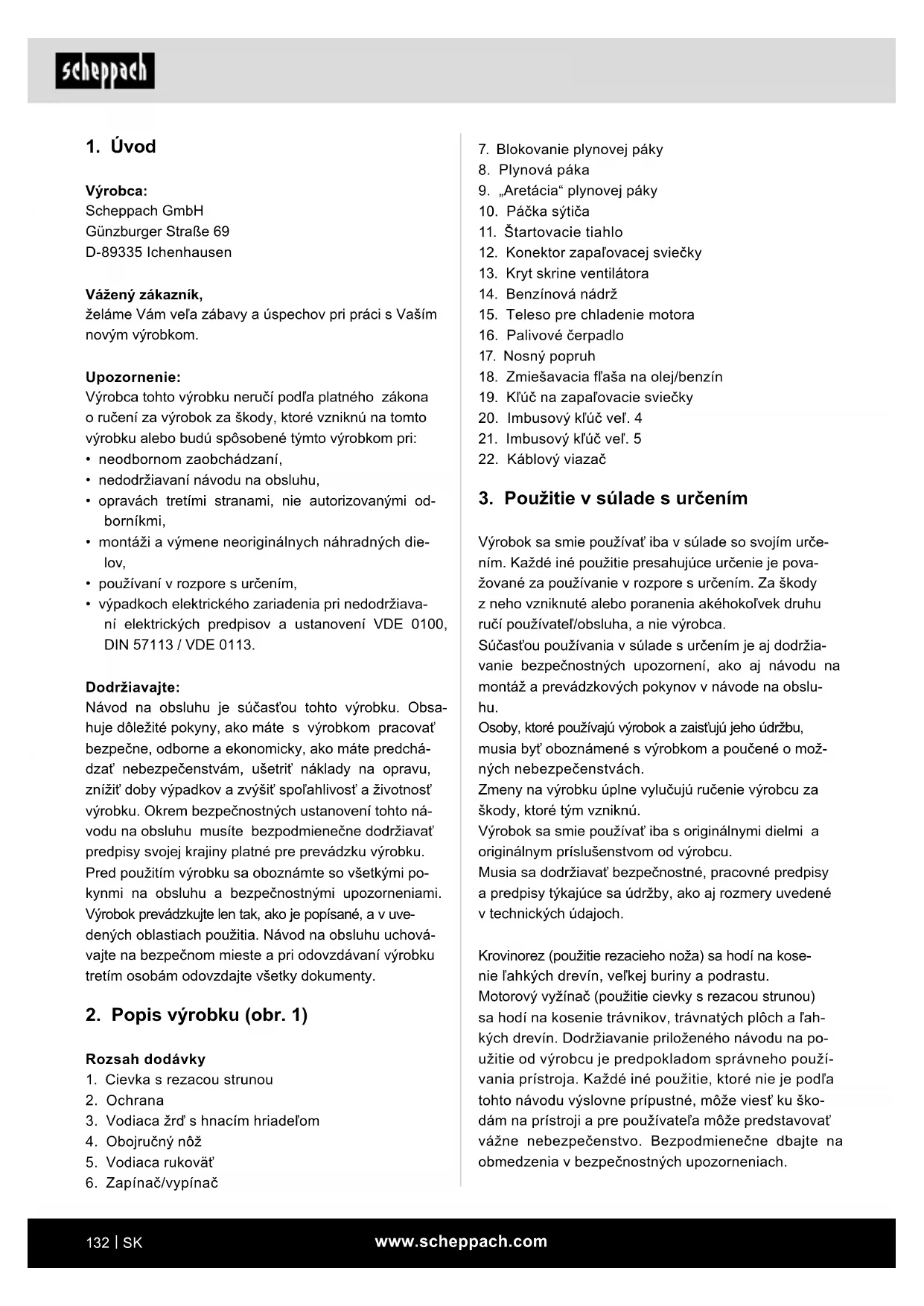 Výrobca: Scheppach GmbH Günzburger Straße 69 D-89335 Ichenhausen Vážený zákazník, želáme Vám veľa zábavy a úspechov pri práci s Vaším novým výrobkom. Upozornenie: Výrobca tohto výrobku neručí podľa platného zákona o ručení za výrobok za škody, ktoré vzniknú na tomto výrobku alebo budú spôsobené týmto výrobkom pri: