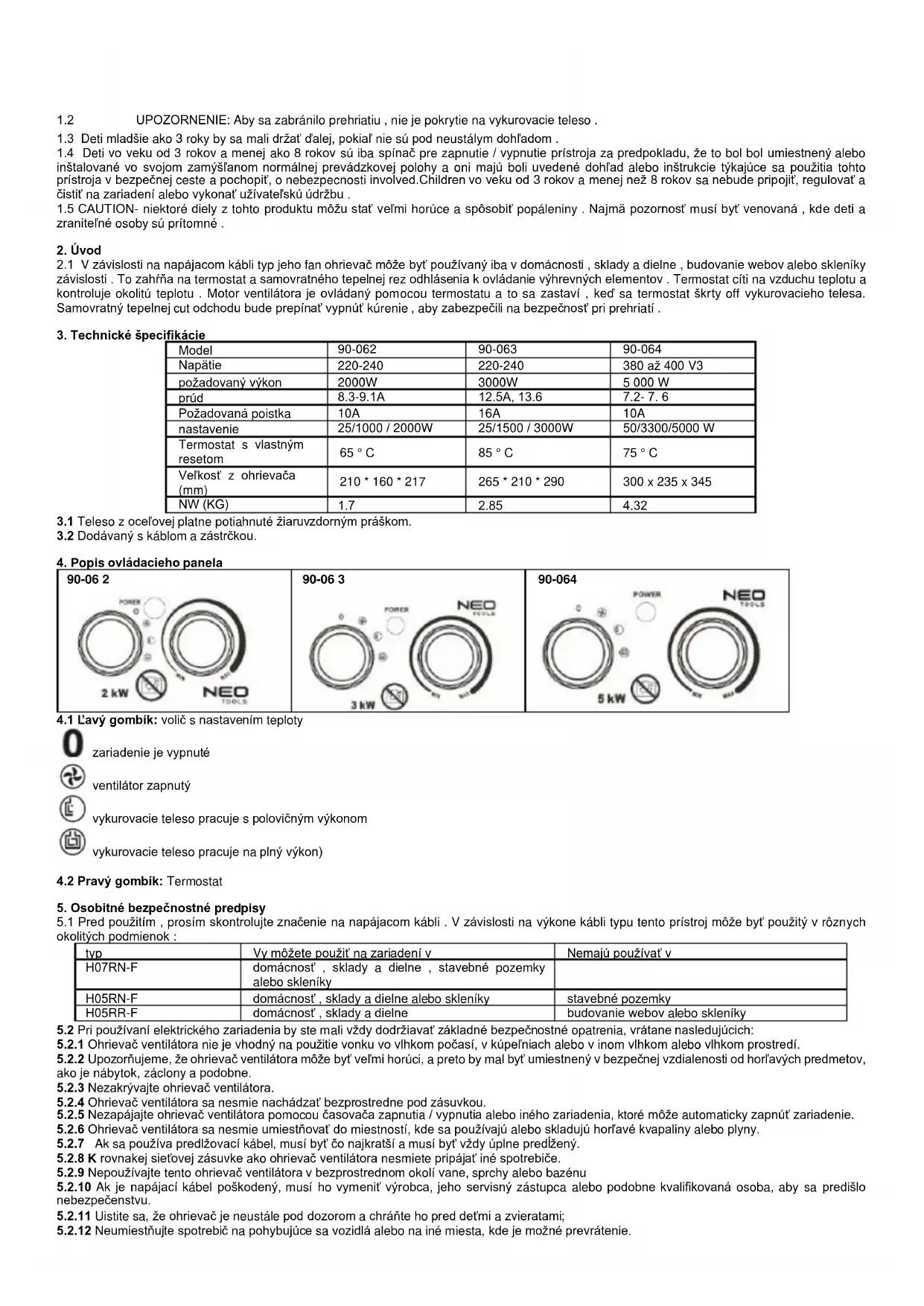 H05RN-F domácnosť , sklady a dielne alebo skleníky stavebné pozemky H05RR-F domácnosť , sklady a dielne budovanie webov alebo skleníky 5.2 Pri používaní elektrického zariadenia by ste mali vždy dodržiavať základné bezpečnostné opatrenia, vrátane nasledujúcich: 5.2.1 Ohrievač ventilátora nie je vhodný na použitie vonku vo vlhkom počasí, v kúpeľniach alebo v inom vlhkom alebo vlhkom prostredí. 5.2.2 Upozorňujeme, že ohrievač ventilátora môže byť veľmi horúci, a preto by mal byť umiestnený v bezpečnej vzdialenosti od horľavých predmetov, ako je nábytok, záclony a podobne.