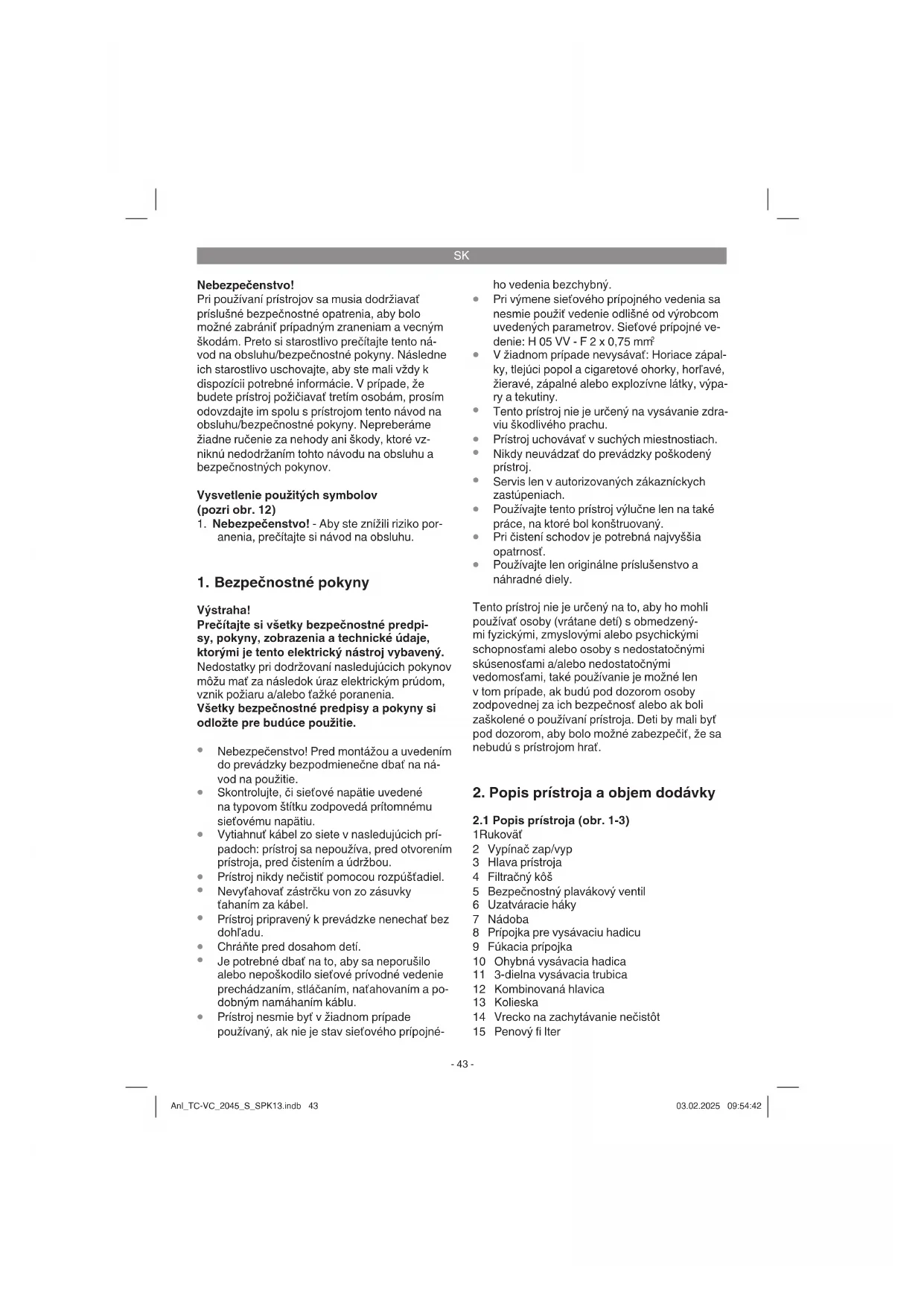 1 Rukoväť 2 Vypínač zap/vyp 3 Hlava prístroja 4 Filtračný kôš 5 Bezpečnostný plavákový ventil 6 Uzatváracie háky 7 Nádoba 8 Prípojka pre vysávaciu hadicu 9 Fúkacia prípojka 10 Ohybná vysávacia hadica 11 3-dielna vysávacia trubica 12 Kombinovaná hlavica 13 Kolieska 14 Vrecko na zachytávanie nečistôt 15 Penový fi lter Anl_TC-VC_2045_S_SPK13.indb 43Anl_TC-VC_2045_S_SPK13.indb 43 03.02.2025 09:54:4203.02.2025 09:54:42SK