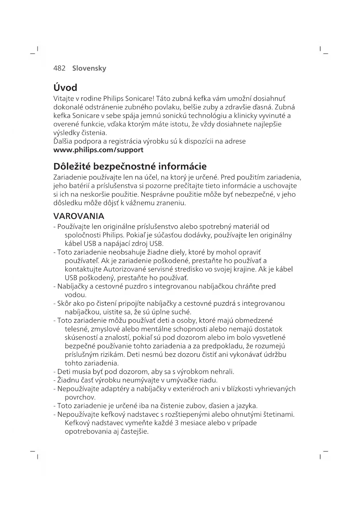 Slovensky Úvod Vitajte v rodine Philips Sonicare! Táto zubná kefka vám umožní dosiahnuť dokonalé odstránenie zubného povlaku, belšie zuby azdravšie ďasná. Zubná kefka Sonicare v sebe spája jemnú sonickú technológiu a klinicky vyvinuté a overené funkcie, vďaka ktorým máte istotu, že vždy dosiahnete najlepšie výsledky čistenia. Ďalšia podpora a registrácia výrobku sú k dispozícii na adrese www.philips.com/support Dôležité bezpečnostné informácie Zariadenie používajte len na účel, na ktorý je určené. Pred použitím zariadenia, jeho batérií a príslušenstva si pozorne prečítajte tieto informácie auschovajte si ich na neskoršie použitie. Nesprávne použitie môže byť nebezpečné, v jeho dôsledku môže dôjsť k vážnemu zraneniu. VAROVANIA - Používajte len originálne príslušenstvo alebo spotrebný materiál od spoločnosti Philips. Pokiaľ je súčasťou dodávky, používajte len originálny kábel USB a napájací zdroj USB. - Toto zariadenie neobsahuje žiadne diely, ktoré by mohol opraviť používateľ. Ak je zariadenie poškodené, prestaňte ho používať a kontaktujte Autorizované servisné stredisko vo svojej krajine. Ak je kábel USB poškodený, prestaňte ho používať. - Nabíjačky a cestovné puzdro sintegrovanou nabíjačkou chráňte pred vodou. - Skôr ako počistení pripojíte nabíjačky acestovné puzdrá sintegrovanou nabíjačkou, uistite sa, že sú úplne suché. - Toto zariadenie môžu používať deti a osoby, ktoré majú obmedzené telesné, zmyslové alebo mentálne schopnosti alebo nemajú dostatok skúseností a znalostí, pokiaľ sú pod dozorom alebo im bolo vysvetlené bezpečné používanie tohto zariadenia a za predpokladu, že rozumejú príslušným rizikám. Deti nesmú bez dozoru čistiť ani vykonávať údržbu tohto zariadenia. - Deti musia byť pod dozorom, aby sa svýrobkom nehrali. - Žiadnu časť výrobku neumývajte v umývačke riadu. - Nepoužívajte adaptéry a nabíjačky vexteriéroch ani vblízkosti vyhrievaných povrchov. - Toto zariadenie je určené iba na čistenie zubov, ďasien a jazyka. - Nepoužívajte kefkový nadstavec srozštiepenými alebo ohnutými štetinami. Kefkový nadstavec vymeňte každé 3 mesiace alebo v prípade opotrebovania aj častejšie.483 Slovensky - Zabráňte priamemu kontaktu s výrobkami obsahujúcimi esenciálne oleje alebo kokosový olej. Kontakt by mohol spôsobiť uvoľnenie štetiniek. - Možno ho používať v maximálnej nadmorskej výške 4500 metrov.