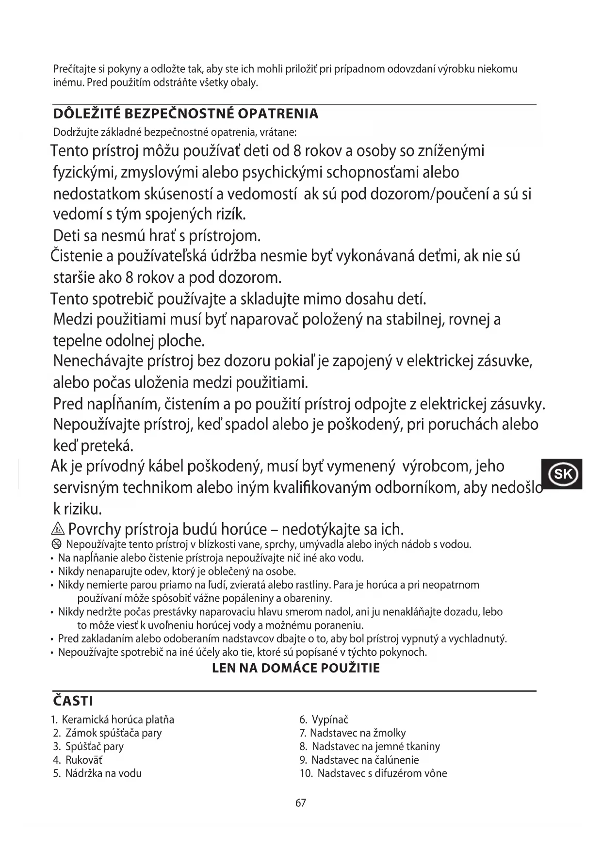 Dodržujte základné bezpečnostné opatrenia, vrátane: Tento prístroj môžu používať deti od 8 rokov a osoby so zníženými fyzickými, zmyslovými alebo psychickými schopnosťami alebo nedostatkom skúseností a vedomostí ak sú pod dozorom/poučení a sú si vedomí s tým spojených rizík. Deti sa nesmú hrať s prístrojom. Čistenie a používateľská údržba nesmie byť vykonávaná deťmi, ak nie sú staršie ako 8 rokov a pod dozorom. Tento spotrebič používajte a skladujte mimo dosahu detí. Medzi použitiami musí byť naparovač položený na stabilnej, rovnej a tepelne odolnej ploche. Nenechávajte prístroj bez dozoru pokiaľ je zapojený v elektrickej zásuvke, alebo počas uloženia medzi použitiami. Pred napĺňaním, čistením a po použití prístroj odpojte z elektrickej zásuvky. Nepoužívajte prístroj, keď spadol alebo je poškodený, pri poruchách alebo keď preteká. Ak je prívodný kábel poškodený, musí byť vymenený výrobcom, jeho servisným technikom alebo iným kvalikovaným odborníkom, aby nedošlo k riziku. h Povrchy prístroja budú horúce – nedotýkajte sa ich. b Nepoužívajte tento prístroj v blízkosti vane, sprchy, umývadla alebo iných nádob s vodou.
