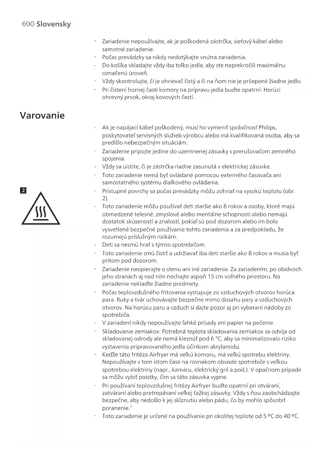 Počas teplovzdušného fritovania vystupuje zo vzduchových otvorov horúca para. Ruky atvár uchovávajte bezpečne mimo dosahu pary avzduchových otvorov. Na horúcu paru avzduch si dajte pozor aj pri vyberaní nádoby zo spotrebiča.