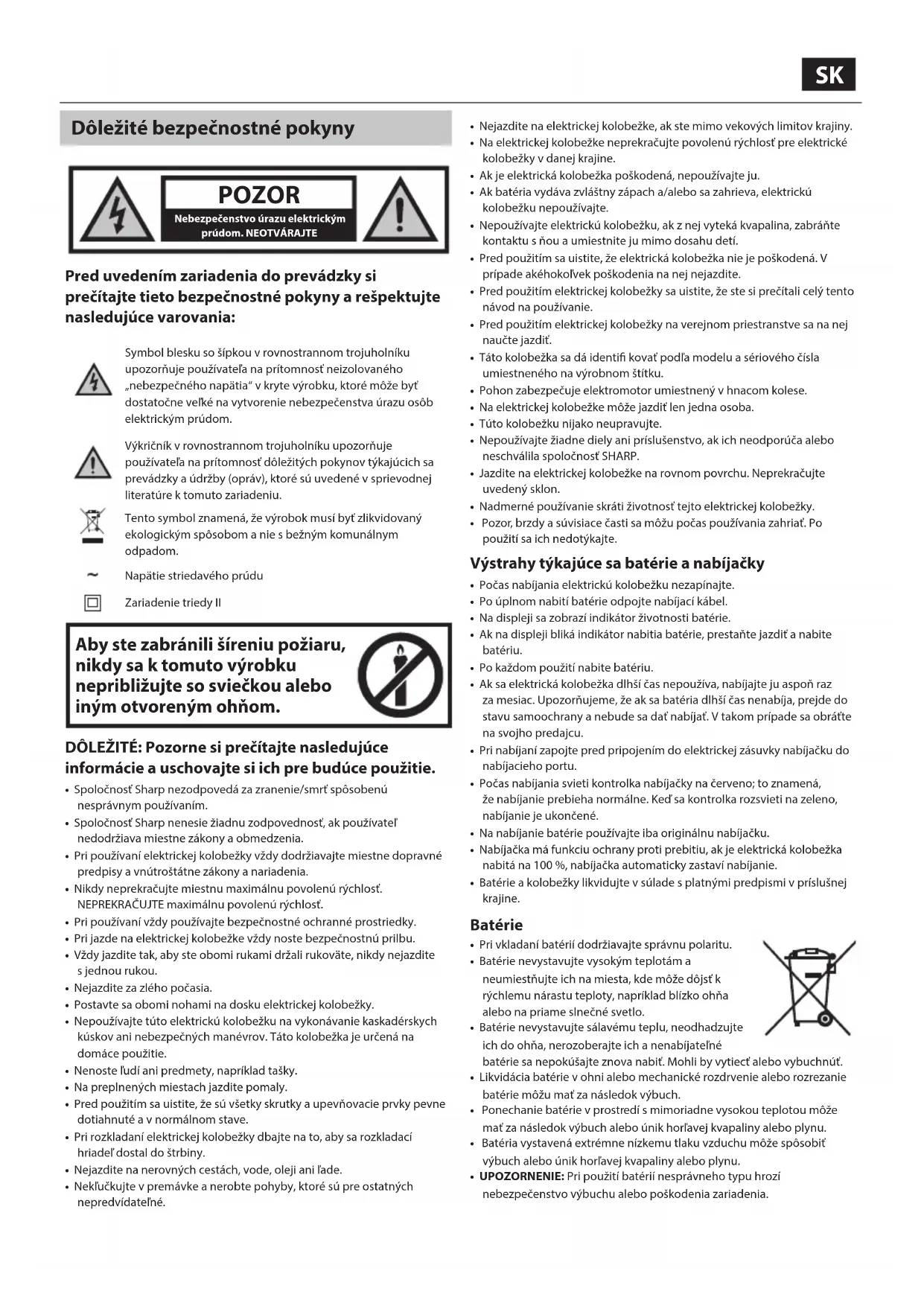 - Spoločnosť Sharp nezodpovedá za zranenie/smrť spôsobenú nesprávnym používaním.• Spoločnosť Sharp nenesie žiadnu zodpovednosť, ak používateľ nedodržiava miestne zákony a obmedzenia.• Pri používaní elektrickej kolobežky vždy dodržiavajte miestne dopravné predpisy a vnútroštátne zákony a nariadenia.• Nikdy neprekračujte miestnu maximálnu povolenú rýchlosť. NEPREKRAČUJTE maximálnu povolenú rýchlosť.• Pri používaní vždy používajte bezpečnostné ochranné prostriedky.• Pri jazde na elektrickej kolobežke vždy noste bezpečnostnú prilbu.• Vždy jazdite tak, aby ste obomi rukami držali rukoväte, nikdy nejazdite s jednou rukou.• Nejazdite za zlého počasia.• Postavte sa obomi nohami na dosku elektrickej kolobežky.• Nepoužívajte túto elektrickú kolobežku na vykonávanie kaskadérskych kúskov ani nebezpečných manévrov. Táto kolobežka je určená na domáce použitie.• Nenoste ľudí ani predmety, napríklad tašky.• Na preplnených miestach jazdite pomaly.• Pred použitím sa uistite, že sú všetky skrutky a upevňovacie prvky pevne dotiahnuté a v normálnom stave.• Pri rozkladaní elektrickej kolobežky dbajte na to, aby sa rozkladací hriadeľ dostal do štrbiny.• Nejazdite na nerovných cestách, vode, oleji ani ľade.• Nekľučkujte v premávke a nerobte pohyby, ktoré sú pre ostatných nepredvídateľné.• Nejazdite na elektrickej kolobežke, ak ste mimo vekových limitov krajiny.• Na elektrickej kolobežke neprekračujte povolenú rýchlosť pre elektrické kolobežky v danej krajine.• Ak je elektrická kolobežka poškodená, nepoužívajte ju.• Ak batéria vydáva zvláštny zápach a/alebo sa zahrieva, elektrickú kolobežku nepoužívajte.• Nepoužívajte elektrickú kolobežku, ak z nej vyteká kvapalina, zabráňte kontaktu s ňou a umiestnite ju mimo dosahu detí.• Pred použitím sa uistite, že elektrická kolobežka nie je poškodená. V prípade akéhokoľvek poškodenia na nej nejazdite.• Pred použitím elektrickej kolobežky sa uistite, že ste si prečítali celý tento návod na používanie.• Pred použitím elektrickej kolobežky na verejnom priestranstve sa na nej naučte jazdiť.• Táto kolobežka sa dá identi kovať podľa modelu a sériového čísla umiestneného na výrobnom štítku.• Pohon zabezpečuje elektromotor umiestnený v hnacom kolese.• Na elektrickej kolobežke môže jazdiť len jedna osoba.• Túto kolobežku nijako neupravujte.• Nepoužívajte žiadne diely ani príslušenstvo, ak ich neodporúča alebo neschválila spoločnosť SHARP.• Jazdite na elektrickej kolobežke na rovnom povrchu. Neprekračujte uvedený sklon.• Nadmerné používanie skráti životnosť tejto elektrickej kolobežky.
