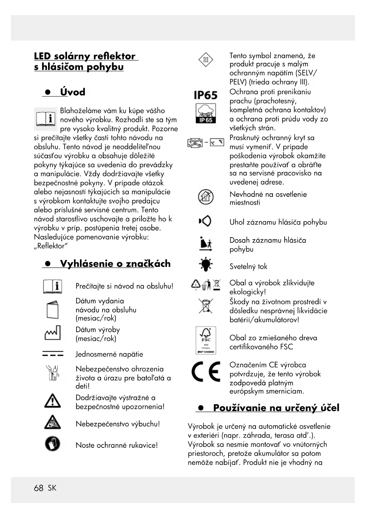 Obal a výrobok zlikvidujte ekologicky! Škody na životnom prostredí v dôsledku nesprávnej likvidácie batérií/akumulátorov! MIX Packaging Obal zo zmiešaného dreva certikovaného FSC Označením CE výrobca potvrdzuje, že tento výrobok zodpovedá platným európskym smerniciam. z Používanie na určený účel Výrobok je určený na automatické osvetlenie v exteriéri (napr. záhrada, terasa atď.). Výrobok sa nesmie montovať vo vnútorných priestoroch, pretože akumulátor sa potom nemôže nabíjať. Produkt nie je vhodný na69