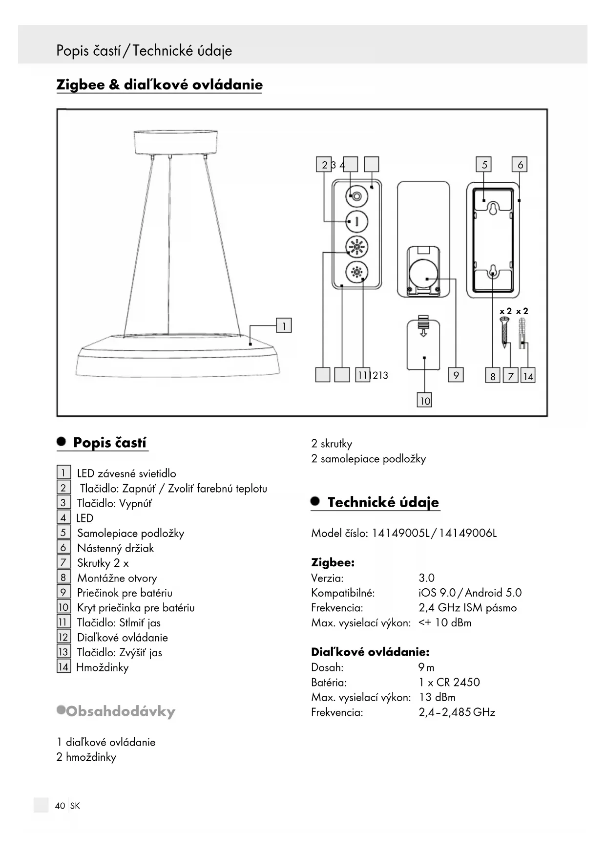 Hmoždinky Obsah dodávky 1 diaľkové ovládanie 2 hmoždinky 2 skrutky 2 samolepiace podložky Technické údaje Model číslo: 14149005L / 14149006L Zigbee: Verzia: 3.0 Kompatibilné: iOS 9.0 / Android 5.0 Frekvencia: 2,4 GHz ISM pásmo Max. vysielací výkon: <+ 10 dBm Diaľkové ovládanie: Dosah: 9 m Batéria: 1 x CR 2450 Max. vysielací výkon: 13 dBm Frekvencia: 2,4‒2,485 GHz Vrátenie svietidla na pôvodné hodnoty / Spojenie diaľkového ovládania a ...41 SK Popis častí / Technické údaje Vrátenie svietidla na pôvodné hodnoty / Spojenie diaľkového ovládania a ... Vrátenie svietidla na pôvodné hodnoty Pre spojenie svietidla s aplikáciou alebo diaľkovým ovládaním sa musí svietidlo nachádzať v režime učenia. Tento je zobrazený pravidelným blikaním svietidla. Ak svietidlo samo nebliká, je potrebné vrátiť svietidlo do režimu učenia. Pre aktivovanie režimu učenia za- a vypínajte svietidlo v nasledovnom rytme: – 10 sek. vyp – 1 sek. zap – 3 sek. vyp – 1 sek. zap – 3 sek. vyp – Zapnúť Svietidlo by teraz malo v režime učenia pravidelne blikať. Poznámka: Tento proces vráti produkt iba do režimu offline a spustí režim učenia. Ak chcete z produktu a cloudu odstrániť všetky údaje, prečítajte si časť „Odpojenie diaľkového ovládania a smartfónu“. Postupujte podľa pokynov a v časti „Odstrániť zariadenie“ vyberte možnosť „Odpojiť a vymazať údaje“. Spojenie diaľkového ovládania a smartfónu s LED závesným svietidlom Poznámka: Informácie o smernici o ochrane osobných údajov nájdete v aplikácii „Lidl Home“.