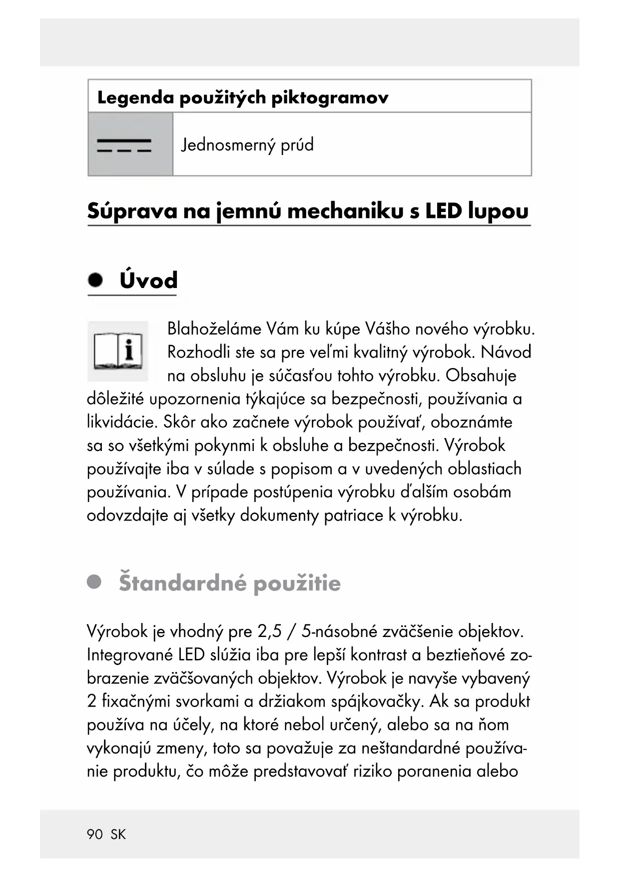 Štandardné použitie Výrobok je vhodný pre 2,5 / 5-násobné zväčšenie objektov. Integrované LED slúžia iba pre lepší kontrast a beztieňové zo- brazenie zväčšovaných objektov. Výrobok je navyše vybavený 2 fixačnými svorkami a držiakom spájkovačky. Ak sa produkt používa na účely, na ktoré nebol určený, alebo sa na ňom vykonajú zmeny, toto sa považuje za neštandardné používa- nie produktu, čo môže predstavovať riziko poranenia alebo91 SK riziko vzniku vecných škôd. Výrobca neručí za škody vzniknuté v dôsledku neštandardného použitia produktu. Výrobok je vhodný výlučne na prevádzku v oblasti interiéru. Výrobok nie je určený na komerčné používanie alebo pre iné oblasti na- sadenia. Tento produkt nie je vhodný pre osvetlenie miestností v domácnosti.