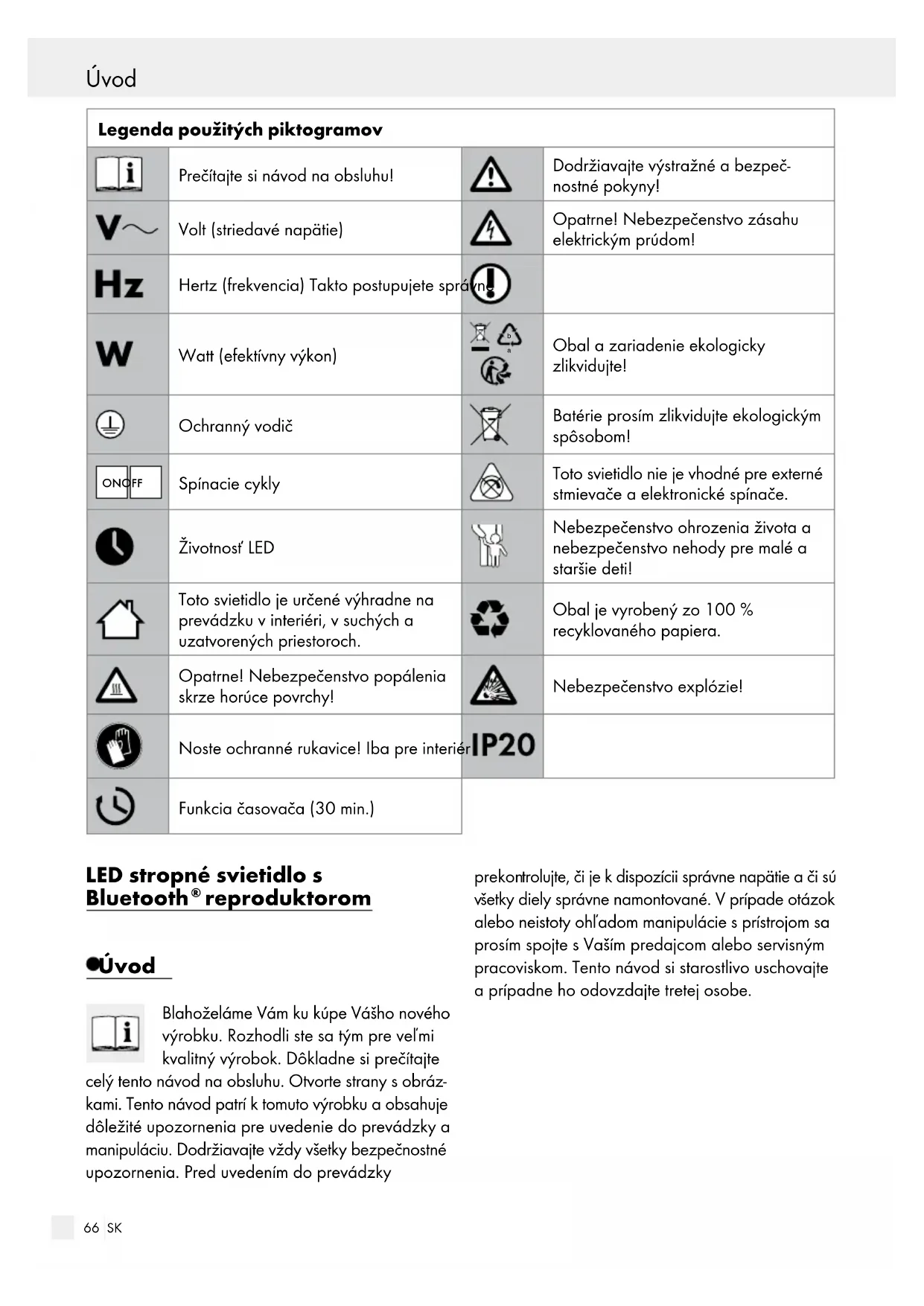 , 50 Hz Menovitý výkon celkovo: max. 25 W (LED 20 W, reproduktor 5 W) Trieda ochrany: | / Druh ochrany: IP20 LED: Osvetľovací prostriedok: LED modul Menovitý výkon: LED, max. 17,5 W Druh ochrany: IP20 Reproduktor / Bluetooth: Frekvenčný rozsah Reproduktor: 120 ‒ 20000 Hz Bluetooth-verzia: 5.0 Dosah Bluetooth: < 10 m Frekvenčný rozsah Bluetooth-frekvencia: 2,4 GHz ISM frekvenčné pásmo HF-výkon: max. +2 dBm Diaľkové ovládanie: Batérie: 2 x 1,5 V AAA Dosah diaľkového ovládania: 5‒6 m (infračervené) Bezpečnosť Bezpečnostné upozornenia V prípade škôd, ktoré vzniknú nedodržiavaním tohto návodu na obsluhu, zaniká garančný nárok!68 SK Bezpečnosť Pri následných škodách nepreberá výrobca ručenie! V prípade vecných škôd alebo poranenia osôb, ktoré boli zapríčinené neodbornou manipuláciou alebo nedodržiavaním bezpečnostných pokynov, nepreberá výrobca ručenie! NEBEZPE-