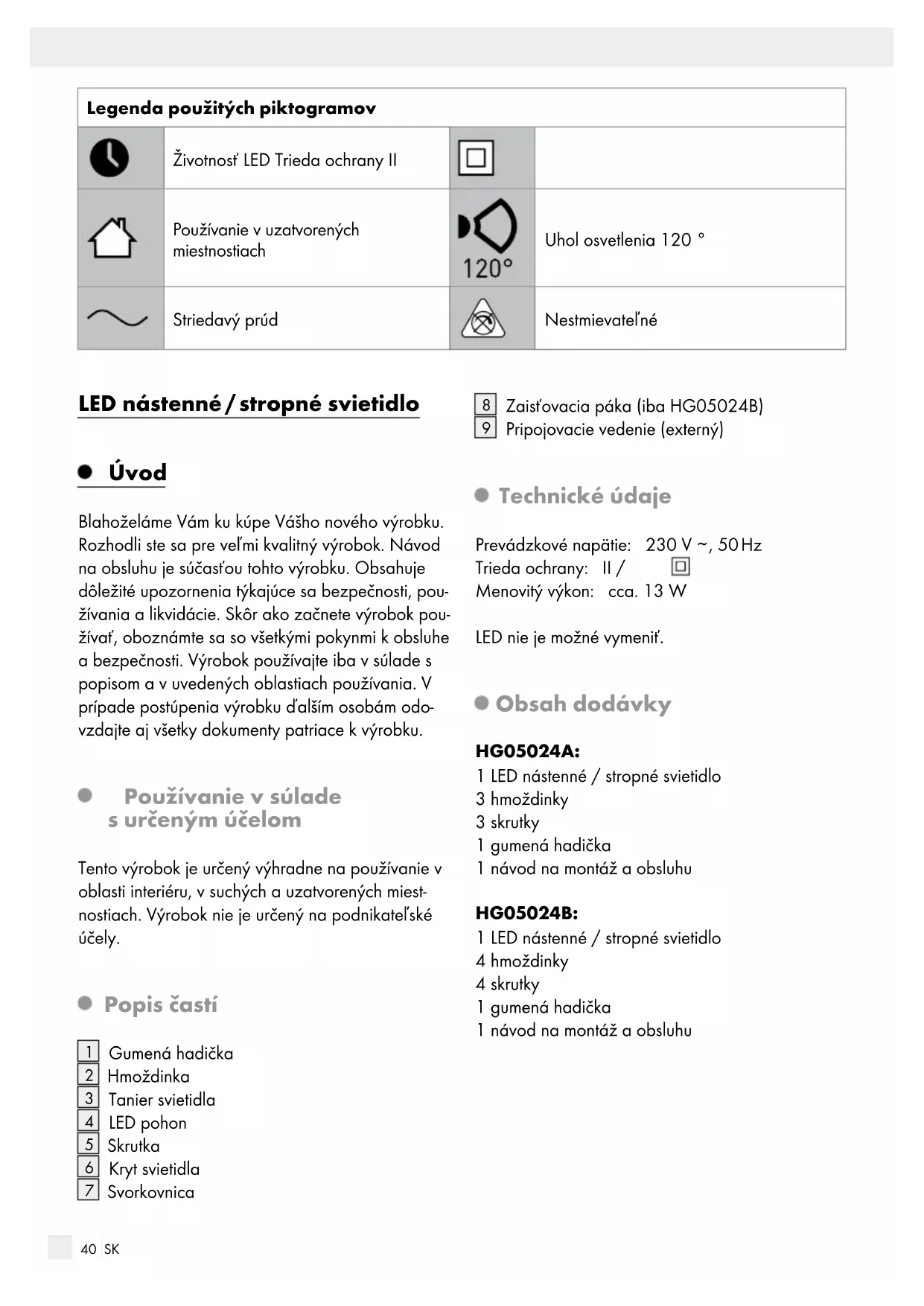 PRE MALÉ I STARŠIE DETI! Nikdy nenechá- vajte deti bez dozoru s obalovým materiálom. Existuje nebezpečenstvo zadusenia obalovým materiálom. Deti často podceňujú nebezpečen- stvo. Držte deti vždy v bezpečnej vzdialenosti od výrobku. Tento výrobok nie je na hranie, nepatrí do rúk deťom. Deti nedokážu rozoznať nebezpečenstvá, ktoré vznikajú pri manipulácii s výrobkom. Tento výrobok môžu používať deti od 8 rokov, ako aj osoby so zníženými psychickými, senzo- rickými alebo duševnými schopnosťami alebo s nedostatkom skúseností a vedomostí, ak sú pod dozorom, alebo ak boli poučené ohľadom bez- pečného používania výrobku, a ak porozumeli nebezpečenstvám spojeným s jeho používaním. Deti sa s výrobkom nesmú hrať. Čistenie a údržbu nesmú vykonávať deti bez dozoru. Výrobok je vhodný výlučne na pre- vádzku v interiéri, v suchých a uzav- retých priestoroch. Produkt alebo obalový materiál nenechávajte voľne ležať bez povšimnutia. Plastové fólie / plastové vrecká, časti z penového polystyrénu atď. by sa mohli stať nebezpečnou hračkou pre deti. Zabráňte nebezpečenstvu ohrozenia života v dôsledku zásahu elektrickým prúdom! Pred používaním sa uistite, že sa prítomné sieťové napätie zhoduje s potrebným prevádzkovým napätím produktu (pozri „Technické údaje“). Pred každým pripojením do siete skontrolujte prípadné poškodenie produktu a sieťového kábla. Poškodený výrobok predstavuje nebezpečenstvo ohrozenia života v dôsledku zásahu elektrickým prúdom. Výrobok nepoužívajte, ak zistíte akékoľvek poškodenia. V prípade zistenia poškodení, potrebných opráv alebo iných problémov s produktom sa obráťte na kvalifikovaného elektrikára. Nikdy neotvárajte žiadny z elektrických pre- vádzkových prostriedkov, ani do nich nestrkajte žiadne predmety. Takéto zásahy predstavujú ohrozenie života v dôsledku zásahu elektrickým prúdom. Bezpodmienečne zabráňte kontaktu produktu s vodou alebo inými kvapalinami. V prípade neistoty sa pri montáži obráťte na kvalifikovaného elektrikára. Tento výrobok nepoužívajte pre tlmiče svetla a elektronické spínače. Nie je vhodný na tieto účely. Výrobok nikdy nepoužívajte v bezprostrednej blízkosti vane, sprchy alebo bazéna. Nepozerajte sa do priameho alebo odrazeného lúča výrobku. Ak Vaše oči zasiahne priamy alebo odrazený lúč výrobku, vedome zatvorte oči a ihneď otočte hlavu preč od lúča. Pre montáž na strop sme priložili montážny ma- teriál, ktorý je vhodný pre bežné, pevné murivo. Pred montážou skontrolujte, či je dodaný materiál vhodný pre charakter steny príp. stropu, na ktorý chcete upevniť výrobok. Výrobok namontujte tak, aby bol chránený pred striekajúcou vodou a znečistením. LED diódy nie je možné vymeniť. Ak LED na konci svojej životnosti vypadnú, je potrebné vymeniť celý výrobok. Tento výrobok smie byť používaný iba so zabu- dovaným LED-predradníkom. Pred uvedením do prevádzky Poznámka: Odstráňte celý obalový materiál z výrobku.42 SK Montáž Upozornenie: Počas montáže budete potrebovať vŕtačku. OPATRNE! NEBEZPEČENSTVO PORANENIA! Prečítajte si návod na obsluhu Vašej vŕtačky. Model HG05024A (okrúhly tvar)