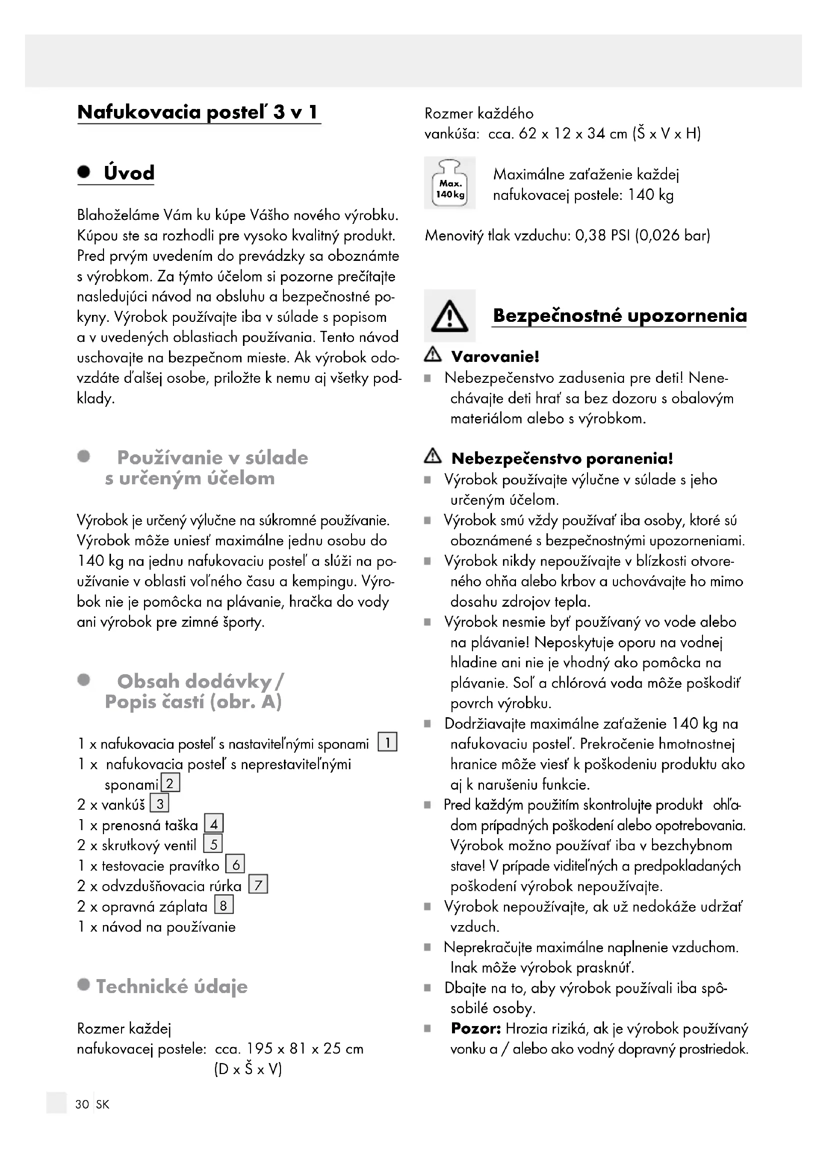 1 x návod na používanie Technické údaje Rozmer každej nafukovacej postele: cca. 195 x 81 x 25 cm (D x Š x V) Rozmer každého vankúša: cca. 62 x 12 x 34 cm (Š x V x H) Max. 140 kg Maximálne zaťaženie každej nafukovacej postele: 140 kg Menovitý tlak vzduchu: 0,38 PSI (0,026 bar) Bezpečnostné upozornenia Varovanie! Nebezpečenstvo zadusenia pre deti! Nene- chávajte deti hrať sa bez dozoru s obalovým materiálom alebo s výrobkom. Nebezpečenstvo poranenia! Výrobok používajte výlučne v súlade s jeho určeným účelom. Výrobok smú vždy používať iba osoby, ktoré sú oboznámené s bezpečnostnými upozorneniami. Výrobok nikdy nepoužívajte v blízkosti otvore- ného ohňa alebo krbov a uchovávajte ho mimo dosahu zdrojov tepla. Výrobok nesmie byť používaný vo vode alebo na plávanie! Neposkytuje oporu na vodnej hladine ani nie je vhodný ako pomôcka na plávanie. Soľ a chlórová voda môže poškodiť povrch výrobku. Dodržiavajte maximálne zaťaženie 140 kg na nafukovaciu posteľ. Prekročenie hmotnostnej hranice môže viesť k poškodeniu produktu ako aj k narušeniu funkcie. Pred každým použitím skontrolujte produkt ohľa- dom prípadných poškodení alebo opotrebovania