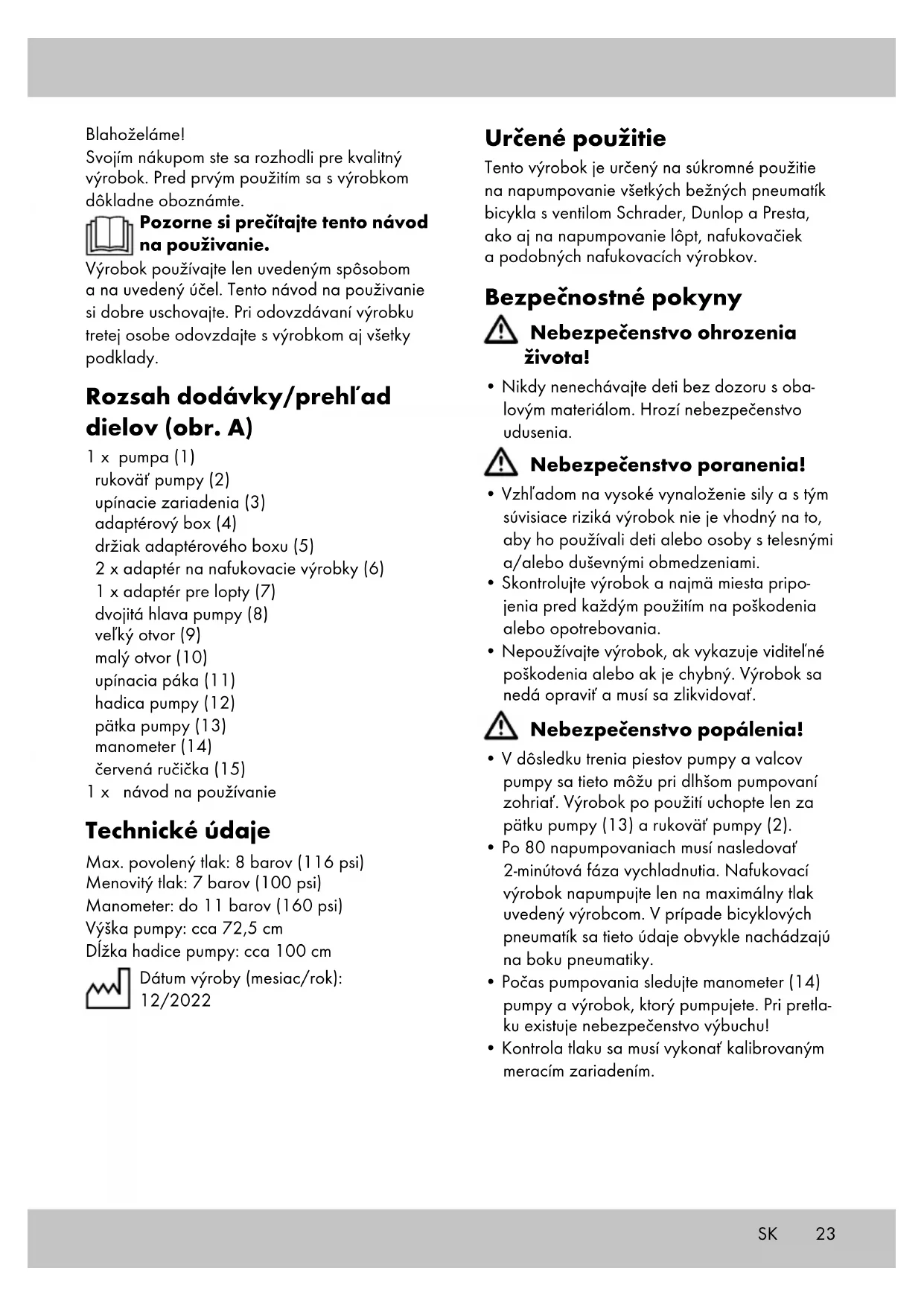 - Pri pumpovaní sa vždy postavte oboma no- hami na pätku pumpy (13), aby ste zabránili prevráteniu výrobku. Hadica pumpy (12) nesmie byť zalomená! Rukoväť pumpy (2) stláčajte rovnomerne a nie príliš rýchlo. Výber adaptéra (obr. B) Adaptéry (6/7) sa nachádzajú v adaptéro- vom boxe (4) na výrobku. Vysuňte adaptérový box z držiaka adaptérového boxu (5). Adapté- rový box odklopte a vyberte potrebný adaptér. Napumpovanie lôpt (obr. C) Zasuňte adaptér pre lopty (7) do veľkého otvoru (9) dvojitej hlavy pumpy (8). Vyklopte upínaciu páku (11) nahor, aby sa adaptér zaistil. Nakoniec zasuňte adaptér do lopty. Napumpovanie nafukovacích výrobkov (obr. D) Otvorte ventil nafukovacieho výrobku. Zasuňte vhodný adaptér pre nafukovací výrobok (6) do veľkého otvoru (9) dvojitej hlavy pumpy (8). Vy- klopte upínaciu páku (11) nahor, aby sa adaptér zaistil. Nakoniec zasuňte adaptér do ventilu nafukovacieho výrobku. Napumpovanie pneumatík s ventilom Dunlop (obr. E) Otvorte uzáver ventilu pneumatiky. Nasuňte malý otvor (10) dvojitej hlavy pumpy (8) na ventil. Vyklopte upínaciu páku (11) nahor, aby sa adaptér zaistil. Napumpovanie pneumatík s ventilom Schrader (obr. F) Otvorte uzáver ventilu pneumatiky. Nasuňte veľký otvor (9) dvojitej hlavy pumpy (8) na ventil. Vyklopte upínaciu páku (11) nahor, aby sa adaptér zaistil. Napumpovanie pneumatík s ventilom Presta (obr. G) Otvorte uzáver ventilu pneumatiky. Uvoľnite maticu ventilu. Nasuňte malý otvor (10) dvojitej hlavy pumpy (8) na ventil. Vyklopte upínaciu páku (11) nahor, aby sa adaptér zaistil. Preprava (obr. H) Hadicu pumpy (12) položte nad rukoväť pumpy (2). Upnite hadicu pumpy do oboch upínacích zariadení (3). Nakoniec môžete výrobok zdvihnúť za rukoväť pumpy a prepraviť. Skladovanie, čistenie Výrobok skladujte vždy na suchom a čistom mieste v temperovanej miestnosti. Neponárajte výrobok do vody, inak by sa po- škodil! Čistite len s vlhkou čistiacou handričkou a nakoniec utrite dosucha. Príležitostne naneste na pohyblivé diely trochu oleja. DÔLEŽITÉ! Výrobok nikdy nečistite ostrými čistia- cimi prostriedkami. Pokyny k likvidácii Výrobok a obalový materiál zlikvidujte podľa aktuálnych miestnych predpisov. Obalový materiál (ako napr. fóliové vrecká) uschovajte mimo dosahu detí. Ďalšie informácie o možnostiach likvidácie zastaraného ýrobku dostanete na svojej obecnej alebo mestskej správe. Výrobok a obal zlikvidujte ekologicky. Recyklačný kód slúži na označenie rôznych materiálov za účelom vrátenia do kolobehu opätovného používania (recyklácia). Kód pozostáva z recyklačného symbolu pre zobrazenie kolobehu opätovného používania a čísla, ktoré označuje materiál.25SK Pokyny k záruke a priebehu servisu Výrobok bol vyrobený veľmi starostlivo a pod stálou kontrolou. Na tento výrobok poskytuje DELTA-SPORT HANDELSKONTOR GmbH súk- romným koncovým užívateľom trojročnú záruku odo dňa kúpy (záručná lehota) po splnení nasle- dovných podmienok. Záruka platí len na chyby materiálu a spracovania. Záruka sa netýka dielov, ktoré podliehajú bežnému opotrebeniu a preto ich možno považovať za opotrebiteľné diely (napr. batérie), ako aj krehkých dielov, napr. vypínače, akumulátory alebo diely, ktoré sú vyrobené zo skla. Nároky z tejto záruky zanikajú, keď sa výrobok používal neodborne alebo nesprávne, mimo určenia na používanie alebo určeného rozsahu používania alebo neboli dodržané pokyny návodu na obsluhu, s výnimkou, že koncový uží- vateľ preukáže, že ide o chybu materiálu alebo spracovania, ktorá nebola spôsobená niektorou z hore uvedených okolností. Záruku je možné uplatniť len počas záručnej lehoty po predložení originálu pokladničného dokladu. Originál pokladničného dokladu preto prosím uschovajte. Záručná doba sa kvôli prípadným záručným opravám, zákonnej záruke alebo ako obchodné gesto nepredlžuje. Platí to aj pre vymenené a opravené diely. Pri reklamáciách sa prosím najskôr obráťte na dole uvedenú Service-Hotline alebo sa s nami spojte prostredníctvom e-mailu. Ak sa jedná o záručný prípad, výrobok – podľa našej voľby – bezplatne opravíme, vymeníme alebo vrátime kúpnu cenu. Ďalšie práva zo záruky nevyplý- vajú. Vaše zákonné práva, hlavne nároky na záručné plnenie voči príslušnému predajcovi, nie sú touto zárukou obmedzené. IAN: 409048_2207 Servis Slovensko Tel.: 0850 232001 E-Mail: deltasport@lidl.sk26 ES ¡Enhorabuena! Con su compra se ha decidido por un artículo de gran calidad. Familiarícese con el artículo antes de usarlo por primera vez. Para ello, lea detenidamente las siguientes instrucciones de uso. Use el artículo solo de la forma descrita y para los campos de aplicación indicados. Conserve estas instrucciones de uso a buen recaudo. Entregue todos los documentos en caso de traspasar el artículo a terceros. Alcance de suministro/Deno- minación de partes (Fig. A) 1 inflador de pie (1) empuñadura de la bomba (2) dispositivos de fijación (3) caja de adaptadores (4) soporte de la caja de adaptadores (5) 2 adaptadores para artículos inflables (6) 1 adaptador para pelotas (7) cabezal de bombeo doble (8) abertura grande (9) abertura pequeña (10) palanca de fijación (11) manguera de bombeo (12) pie de la bomba (13) manómetro (14) aguja roja (15) 1 instrucciones de uso Datos técnicos Presión máxima permitida: 8 bar (116 psi) Presión nominal: 7 bar (100 psi) Manómetro: hasta 11 bar (160 psi) Altura de la bomba: aprox. 72,5 cm Longitud de la manguera de bombeo: aprox. 100 cm Fecha de fabricación (mes/año): 12/2022 Uso previsto Este artículo es para uso privado y es adecuado para inflar todos los neumáticos de bicicleta co- munes con válvulas Schrader, Dunlop y Presta, así como para inflar pelotas, colchones de aire y artículos similares. I