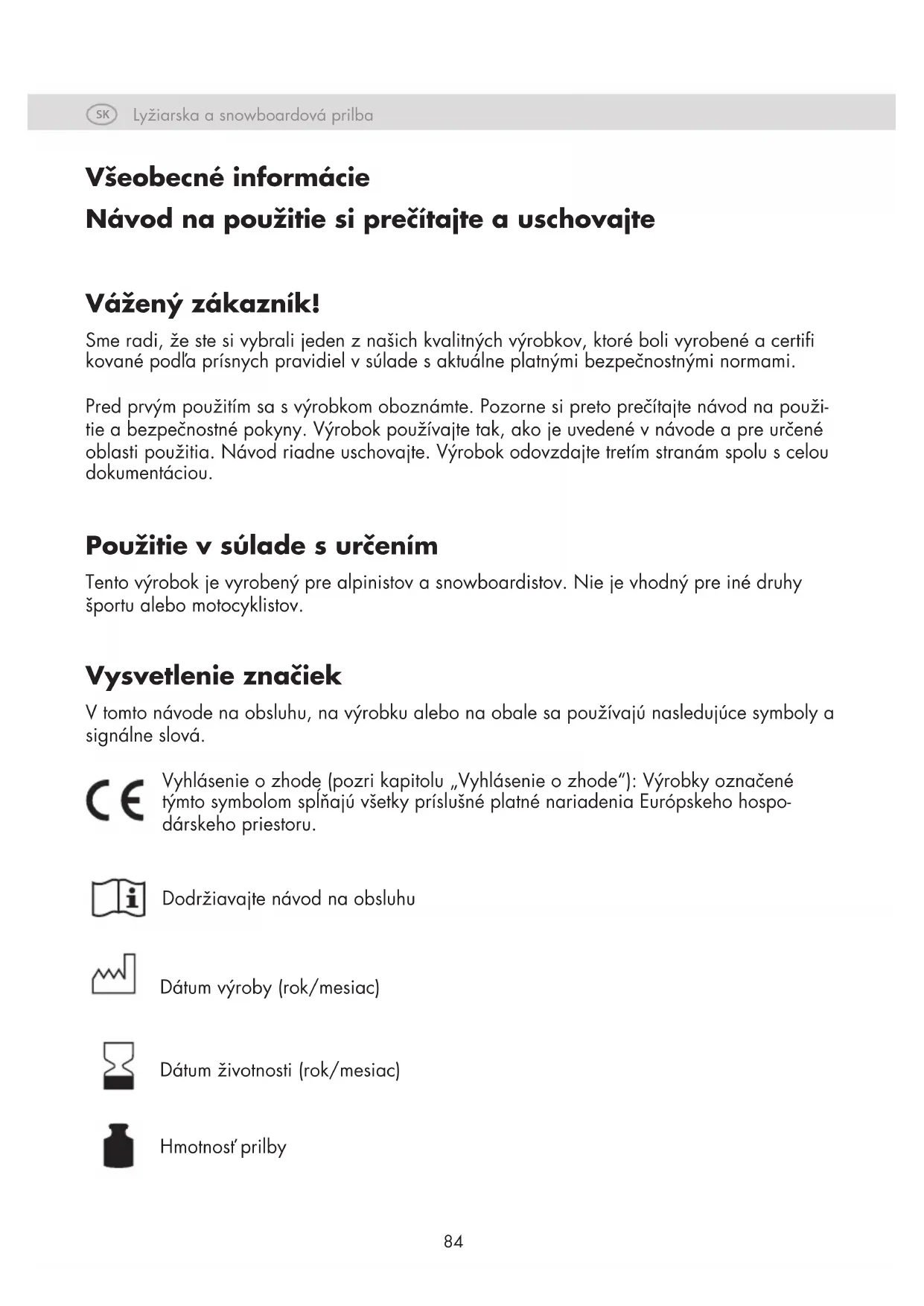 Všeobecné informácie Návod na použitie si prečítajte a uschovajte Vážený zákazník! Sme radi, že ste si vybrali jeden z našich kvalitných výrobkov, ktoré boli vyrobené a certi kované podľa prísnych pravidiel v súlade s aktuálne platnými bezpečnostnými normami. Pred prvým použitím sa s výrobkom oboznámte. Pozorne si preto prečítajte návod na použi- tie a bezpečnostné pokyny. Výrobok používajte tak, ako je uvedené v návode a pre určené oblasti použitia. Návod riadne uschovajte. Výrobok odovzdajte tretím stranám spolu s celou dokumentáciou. Použitie v súlade s určením Tento výrobok je vyrobený pre alpinistov a snowboardistov. Nie je vhodný pre iné druhy športu alebo motocyklistov. Vysvetlenie značiek V tomto návode na obsluhu, na výrobku alebo na obale sa používajú nasledujúce symboly a signálne slová. Vyhlásenie o zhode (pozri kapitolu „Vyhlásenie o zhode“): Výrobky označené týmto symbolom spĺňajú všetky príslušné platné nariadenia Európskeho hospo- dárskeho priestoru. Dodržiavajte návod na obsluhu Dátum výroby (rok/mesiac) Dátum životnosti (rok/mesiac) Hmotnosť prilbyLyžiarska a snowboardová prilba