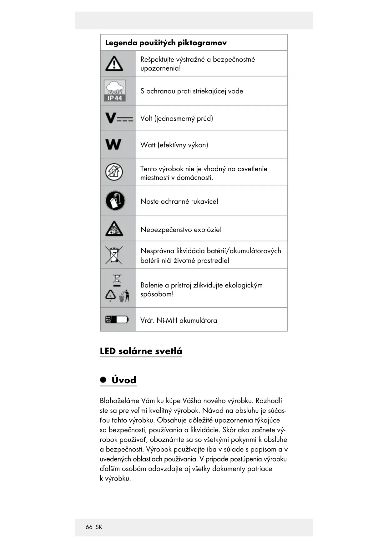 Balenie a prístroj zlikvidujte ekologickým spôsobom! Vrát. Ni-MH akumulátora LED solárne svetlá Úvod Blahoželáme Vám ku kúpe Vášho nového výrobku. Rozhodli ste sa pre veľmi kvalitný výrobok. Návod na obsluhu je súčas- ťou tohto výrobku. Obsahuje dôležité upozornenia týkajúce sa bezpečnosti, používania a likvidácie. Skôr ako začnete vý- robok používať, oboznámte sa so všetkými pokynmi k obsluhe a bezpečnosti. Výrobok používajte iba v súlade s popisom a v uvedených oblastiach používania. V prípade postúpenia výrobku ďalším osobám odovzdajte aj všetky dokumenty patriace k výrobku.67 SK Používanie v súlade s určeným účelom Produkt slúži na osvetlenie vo vonkajších priestoroch. Produkt nie je určený na komerčné účely alebo pre iné oblasti nasadenia. Tento produkt nie je vhodný pre osvetlenie miestností v domácnosti. Tento produkt je vhodný pre extrémne teploty do -21°C. Popis častí