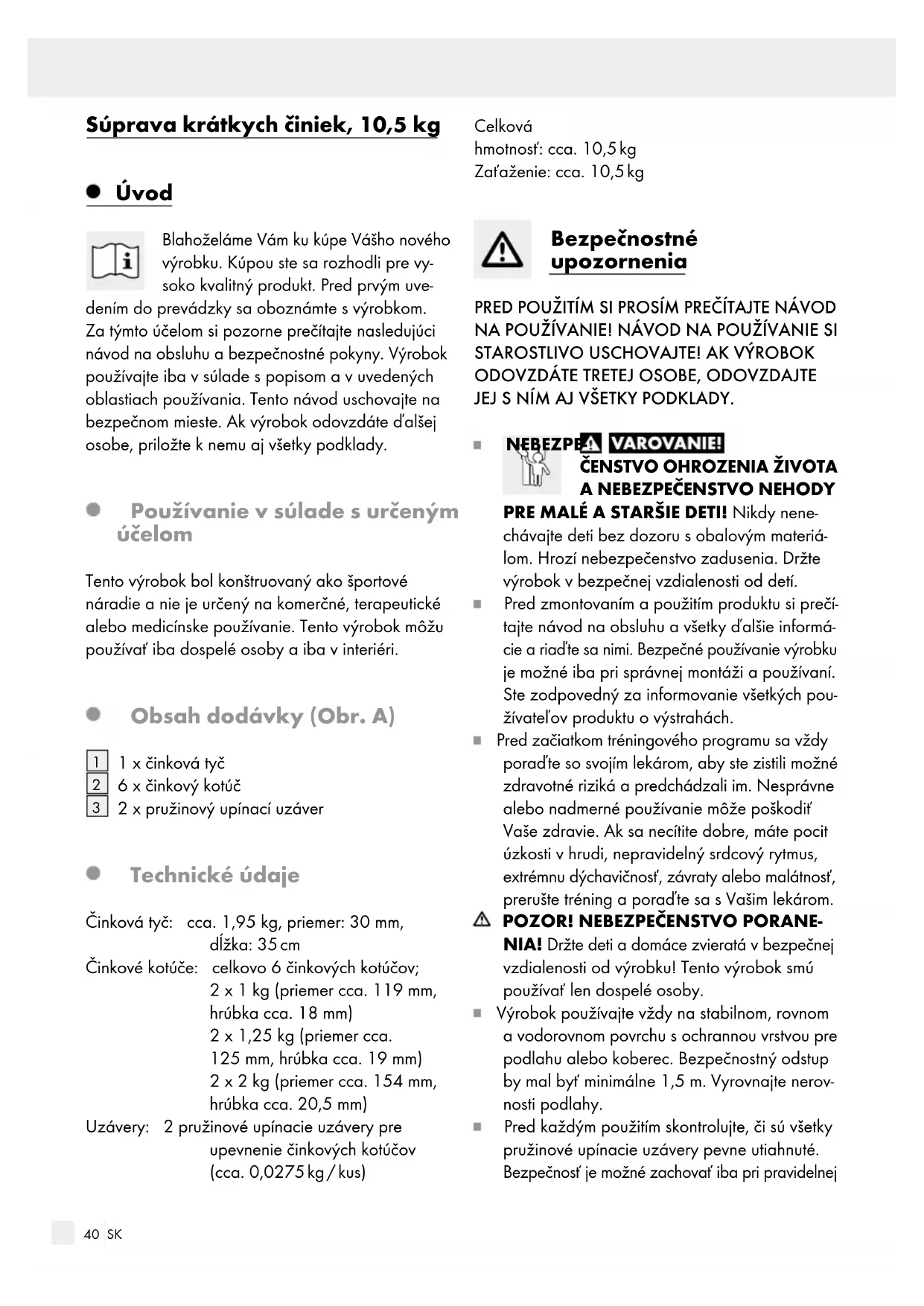 2 x pružinový upínací uzáver Technické údaje Činková tyč: cca. 1,95 kg, priemer: 30 mm, dĺžka: 35 cm Činkové kotúče: celkovo 6 činkových kotúčov; 2 x 1 kg (priemer cca. 119 mm, hrúbka cca. 18 mm) 2 x 1,25 kg (priemer cca. 125 mm, hrúbka cca. 19 mm) 2 x 2 kg (priemer cca. 154 mm, hrúbka cca. 20,5 mm) Uzávery: 2 pružinové upínacie uzávery pre upevnenie činkových kotúčov (cca. 0,0275 kg / kus) Celková hmotnosť: cca. 10,5 kg Zaťaženie: cca. 10,5 kg Bezpečnostné upozornenia PRED POUŽITÍM SI PROSÍM PREČÍTAJTE NÁVOD NA POUŽÍVANIE! NÁVOD NA POUŽÍVANIE SI