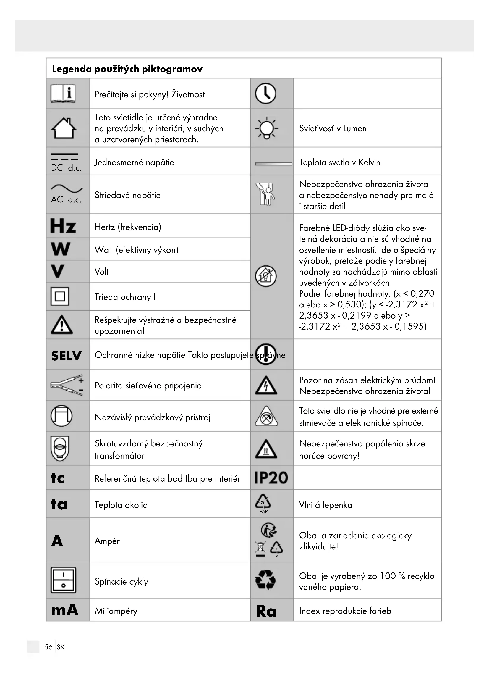 Index reprodukcie farieb57 SK ÚvodLegenda použitých piktogramov Svetelná lišta s LED diódami Úvod Blahoželáme Vám ku kúpe Vášho nového výrobku. Rozhodli ste sa tým pre veľmi kvalitný výrobok. Dôkladne si prečítajte celý tento návod na obsluhu. Tento návod patrí k tomuto výrobku a obsahuje dôležité upozornenia pre uvedenie do prevádzky a manipuláciu. Dodr- žiavajte vždy všetky bezpečnostné upozornenia. Pred uvedením do prevádzky prekontrolujte, či je k dispozícii správne napätie a či sú všetky diely správne namontované. V prípade otázok alebo neistoty ohľadom manipulácie s prístrojom sa prosím spojte s Vaším predajcom alebo servisným pracoviskom. Tento návod si starostlivo uschovajte a prípadne ho odovzdajte tretej osobe. Používanie v súlade s určeným účelom Toto svietidlo je určené výhradne na pre- vádzku v interiéri, v suchých a uzatvore- ných priestoroch. Toto svietidlo je určené iba na používanie v súkrom- ných domácnostiach a nie na komerčné používanie. Iné používanie ako vyššie popísané je neprípustné a vedie k poškodeniu tohto produktu. Okrem toho je to spojené s nebezpečenstvami ako napr. skrat, požiar, zásah elektrickým prúdom atď. Tento výro- bok je určený len na normálnu prevádzku. Farebné LED-diódy slúžia ako svetelná dekorácia a nie sú vhodné na osvetlenie miestností. Ide o špeciálny výrobok, pretože podiely farebnej hodnoty sa nachádzajú mimo ob- lastí uvedených v zátvorkách. Podiel farebnej hodnoty: (x < 0,270 alebo x > 0,530); (y < -2,3172 x² + 2,3653 x - 0,2199 alebo y > -2,3172 x² + 2,3653 x - 0,1595). Obsah dodávky Bezprostredne po vybalení vždy skontrolujte úplnosť dodávky ako aj bezchybný stav zariadenia. 1 LED svetelná lišta, 14149505L / 14149506L 2 hmoždinky 2 skrutky 1 návod na montáž a používanie Popis častí