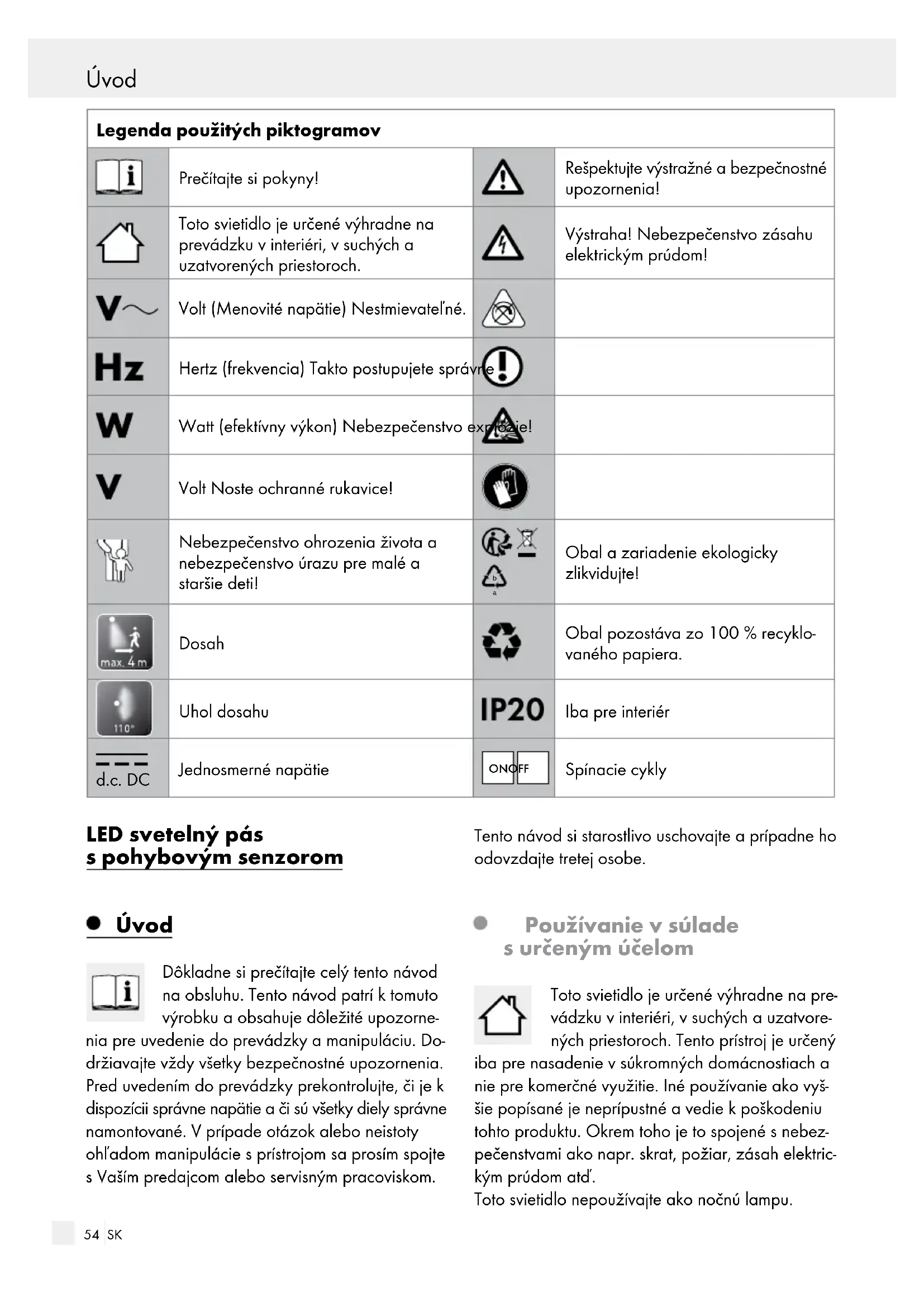 Obal a zariadenie ekologicky zlikvidujte! Dosah Obal pozostáva zo 100 % recyklo- vaného papiera. Uhol dosahu Iba pre interiér d.c. DC Jednosmerné napätie ON OFF Spínacie cykly LED svetelný pás s pohybovým senzorom Úvod Dôkladne si prečítajte celý tento návod na obsluhu. Tento návod patrí k tomuto výrobku a obsahuje dôležité upozorne- nia pre uvedenie do prevádzky a manipuláciu. Do- držiavajte vždy všetky bezpečnostné upozornenia. Pred uvedením do prevádzky prekontrolujte, či je k dispozícii správne napätie a či sú všetky diely správne namontované. V prípade otázok alebo neistoty ohľadom manipulácie s prístrojom sa prosím spojte s Vaším predajcom alebo servisným pracoviskom. Tento návod si starostlivo uschovajte a prípadne ho odovzdajte tretej osobe. Používanie v súlade s určeným účelom Toto svietidlo je určené výhradne na pre- vádzku v interiéri, v suchých a uzatvore- ných priestoroch. Tento prístroj je určený iba pre nasadenie v súkromných domácnostiach a nie pre komerčné využitie. Iné používanie ako vyš- šie popísané je neprípustné a vedie k poškodeniu tohto produktu. Okrem toho je to spojené s nebez- pečenstvami ako napr. skrat, požiar, zásah elektric- kým prúdom atď. Toto svietidlo nepoužívajte ako nočnú lampu. Úvod / Bezpečnosť55 SK Úvod Úvod / Bezpečnosť Obsah dodávky Bezprostredne po vybalení vždy skontrolujte úplnosť dodávky ako aj bezchybný stav zariadenia. 1 LED pás 1 lepiaci pásik 4 batérie 1,5 V AAA 1 návod na používanie Popis častí