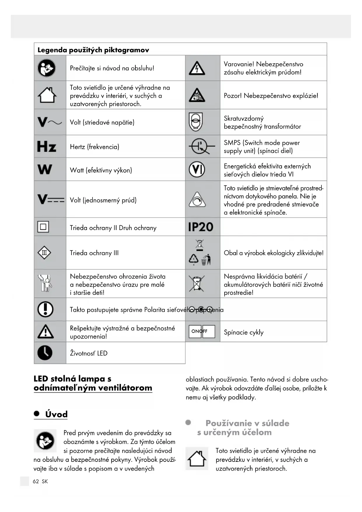 Obal a výrobok ekologicky zlikvidujte! Nebezpečenstvo ohrozenia života a nebezpečenstvo úrazu pre malé i staršie deti! Nesprávna likvidácia batérií / akumulátorových batérií ničí životné prostredie! Takto postupujete správne Polarita sieťového pripojenia Rešpektujte výstražné a bezpečnostné upozornenia! ON OFF Spínacie cykly Životnosť LED LED stolná lampa s odnímateľným ventilátorom Úvod Pred prvým uvedením do prevádzky sa oboznámte s výrobkom. Za týmto účelom si pozorne prečítajte nasledujúci návod na obsluhu a bezpečnostné pokyny. Výrobok použí- vajte iba v súlade s popisom a v uvedených oblastiach používania. Tento návod si dobre uscho- vajte. Ak výrobok odovzdáte ďalšej osobe, priložte k nemu aj všetky podklady. Používanie v súlade s určeným účelom Toto svietidlo je určené výhradne na prevádzku v interiéri, v suchých a uzatvorených priestoroch.63 SK Používajte svietidlo iba ako je uvedené v tomto návode na používanie. Každé iné používanie je v rozpore s určeným účelom a môže viesť k vzniku vecných škôd alebo dokonca k poraneniu osôb. Svietidlo nie je detská hračka. Výrobca ani predajca nepreberá ručenie za škody vzniknuté v dôsledku používania, ktoré nie je v súlade s určeným účelom alebo v dôsledku nesprávneho používania. Obsah dodávky 1 LED stolová lampa s odnímateľným ventilátorom, model 55399 1 sieťový diel 1 mikro USB kábel 1 návod na obsluhu Popis častí