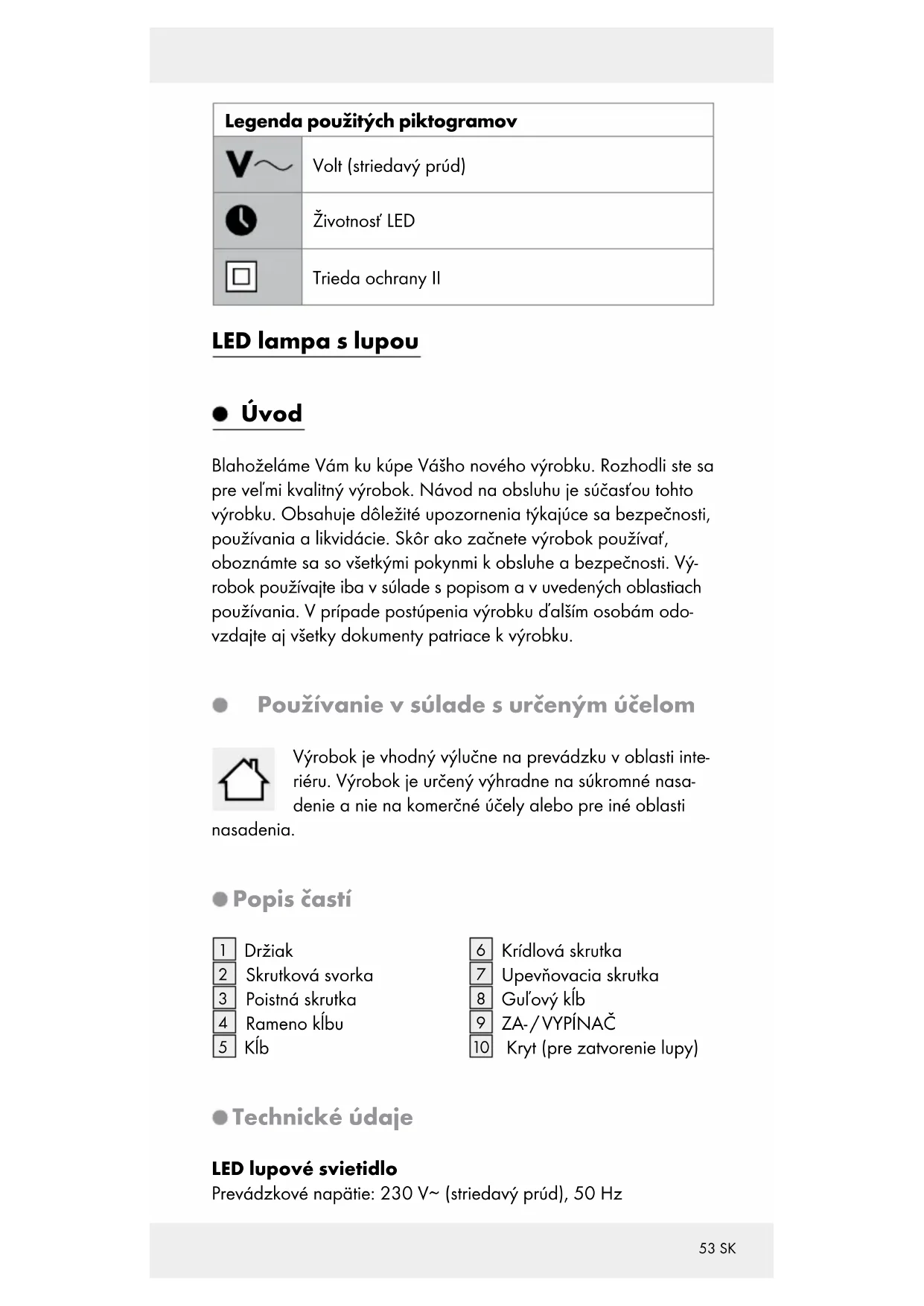 Kryt (pre zatvorenie lupy) Technické údaje LED lupové svietidlo Prevádzkové napätie: 230 V∼ (striedavý prúd), 50 Hz54 SK Príkon: cca. 6,3 W Trieda ochrany: II / TÜV SÜD / GS certifikované Lupa Veľkosť šošovky: cca. 5 dioptrií Zväčšenie: cca. 2,25-násobné Obsah dodávky 1 LED lupové svietidlo 1 poistná skrutka 1 krídlová skrutka 1 držiak 1 skrutková svorka 1 návod na používanie Bezpečnosť Bezpečnostné upozornenia USCHOVAJTE VŠETKY BEZPEČNOSTNÉ UPOZORNENIA A POKYNY PRE NESKORŠIE POUŽITIE! NEBEZPEČENSTVO