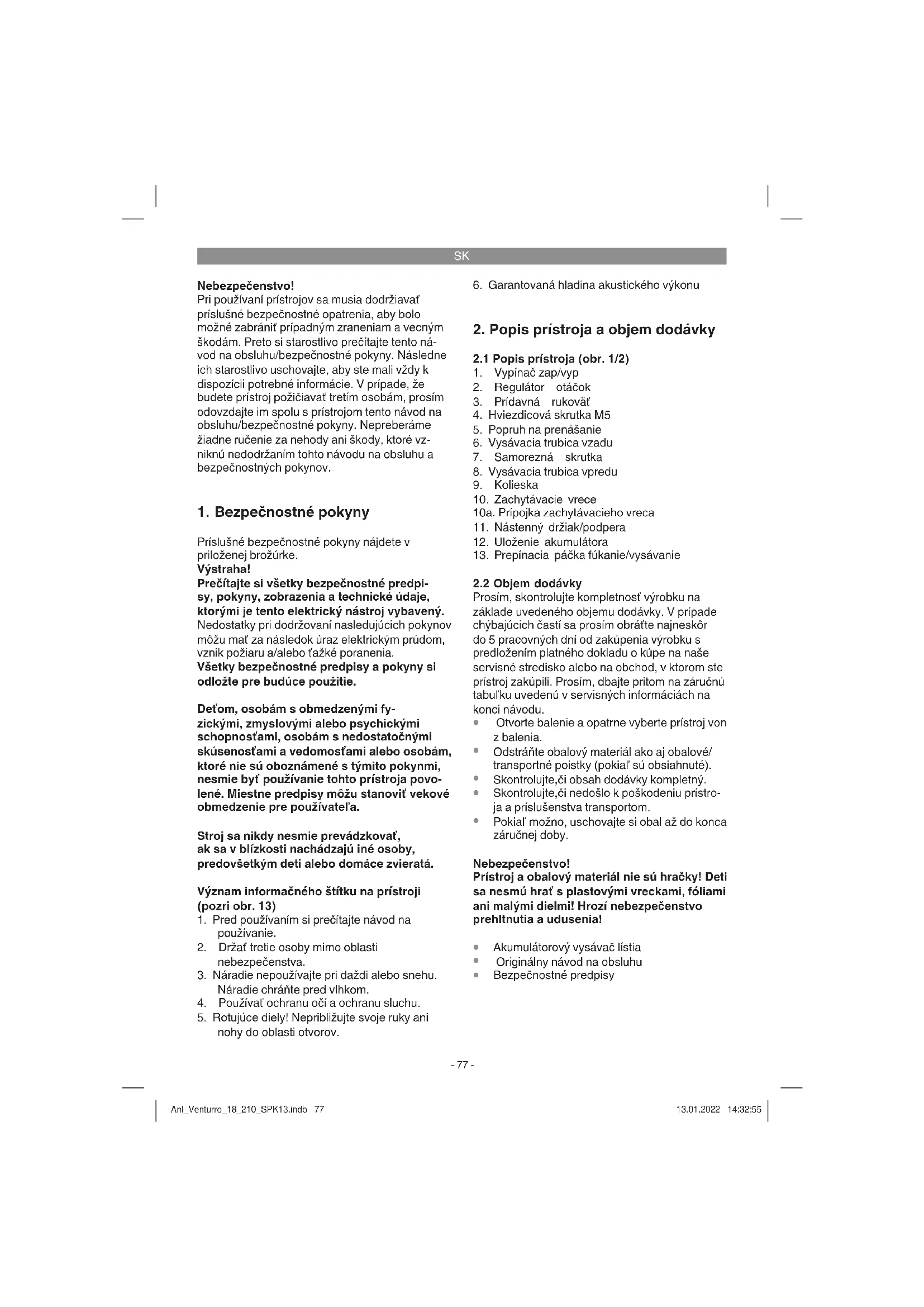 Používajte ochranu sluchu. Pozor! Zvyškové riziká Aj napriek tomu, že budete elektrický prístroj obsluhovať podľa predpisov, budú existovať zvyškové riziká. V súvislosti s konštrukciou Anl_Venturro_18_210_SPK13.indb 78Anl_Venturro_18_210_SPK13.indb 78 13.01.2022 14:32:5513.01.2022 14:32:55SK
