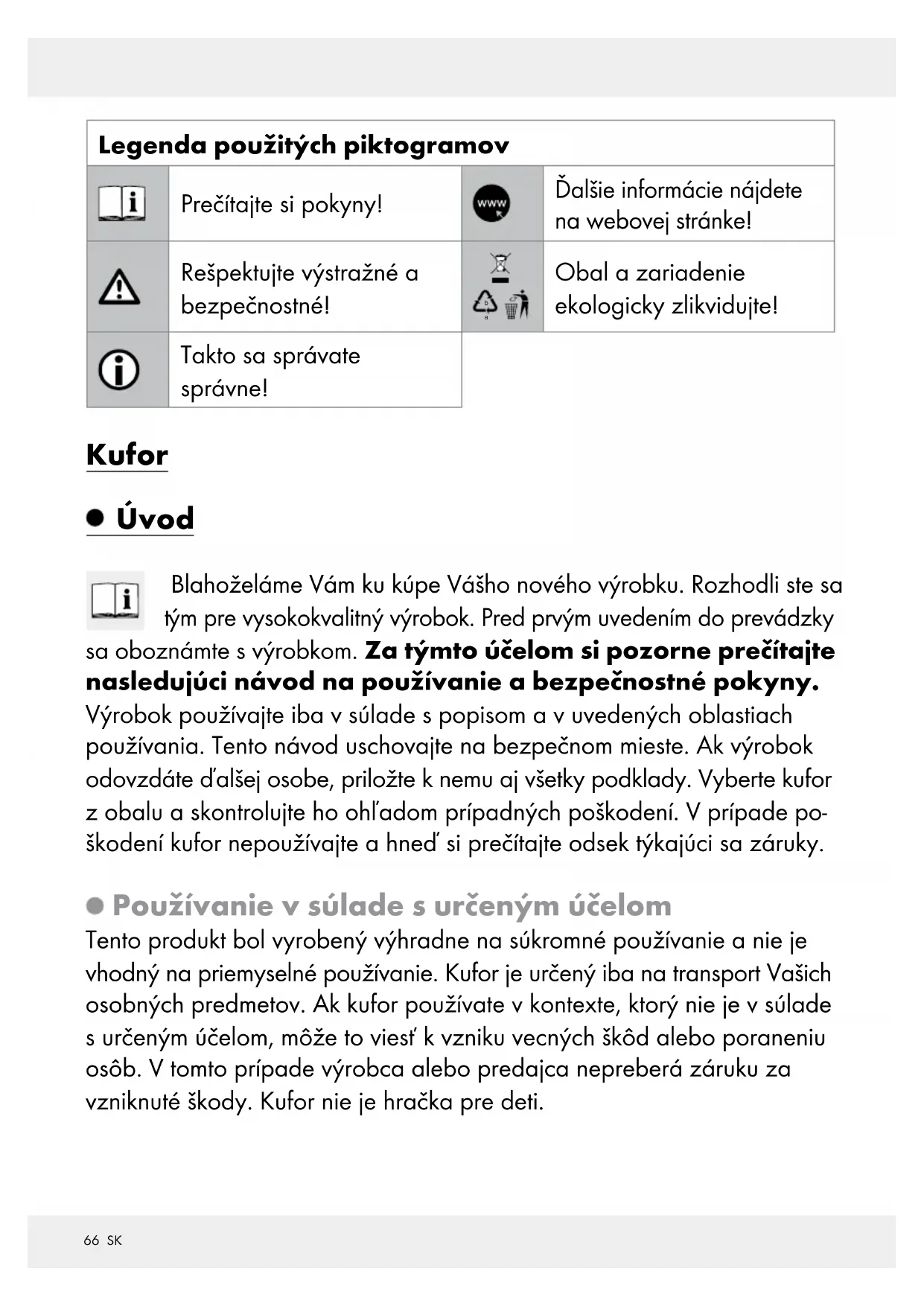 ým pre vysokokvalitný výrobok. Pred prvým uvedením do prevádzky sa oboznámte s výrobkom. Za týmto účelom si pozorne prečítajte nasledujúci návod na používanie a bezpečnostné pokyny. Výrobok používajte iba v súlade s popisom a v uvedených oblastiach používania. Tento návod uschovajte na bezpečnom mieste. Ak výrobok odovzdáte ďalšej osobe, priložte k nemu aj všetky podklady. Vyberte kufor z obalu a skontrolujte ho ohľadom prípadných poškodení. V prípade po- škodení kufor nepoužívajte a hneď si prečítajte odsek týkajúci sa záruky. Používanie v súlade s určeným účelom Tento produkt bol vyrobený výhradne na súkromné používanie a nie je vhodný na priemyselné používanie. Kufor je určený iba na transport Vašich osobných predmetov. Ak kufor používate v kontexte, ktorý nie je v súlade s určeným účelom, môže to viesť k vzniku vecných škôd alebo poraneniu osôb. V tomto prípade výrobca alebo predajca nepreberá záruku za vzniknuté škody. Kufor nie je hračka pre deti.67 SK Popis častí
